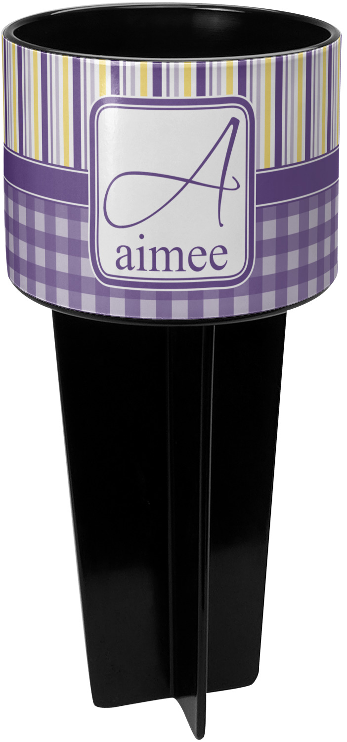 This cup holder has a large stake at its bottom that anchors it to the sand or ground below, while the cup holder rests above the stake. The entire drink holder is made of durable plastic and displays your customization around the cup holder portion. We sell these personalized beach spikers in two different colors: black and white.