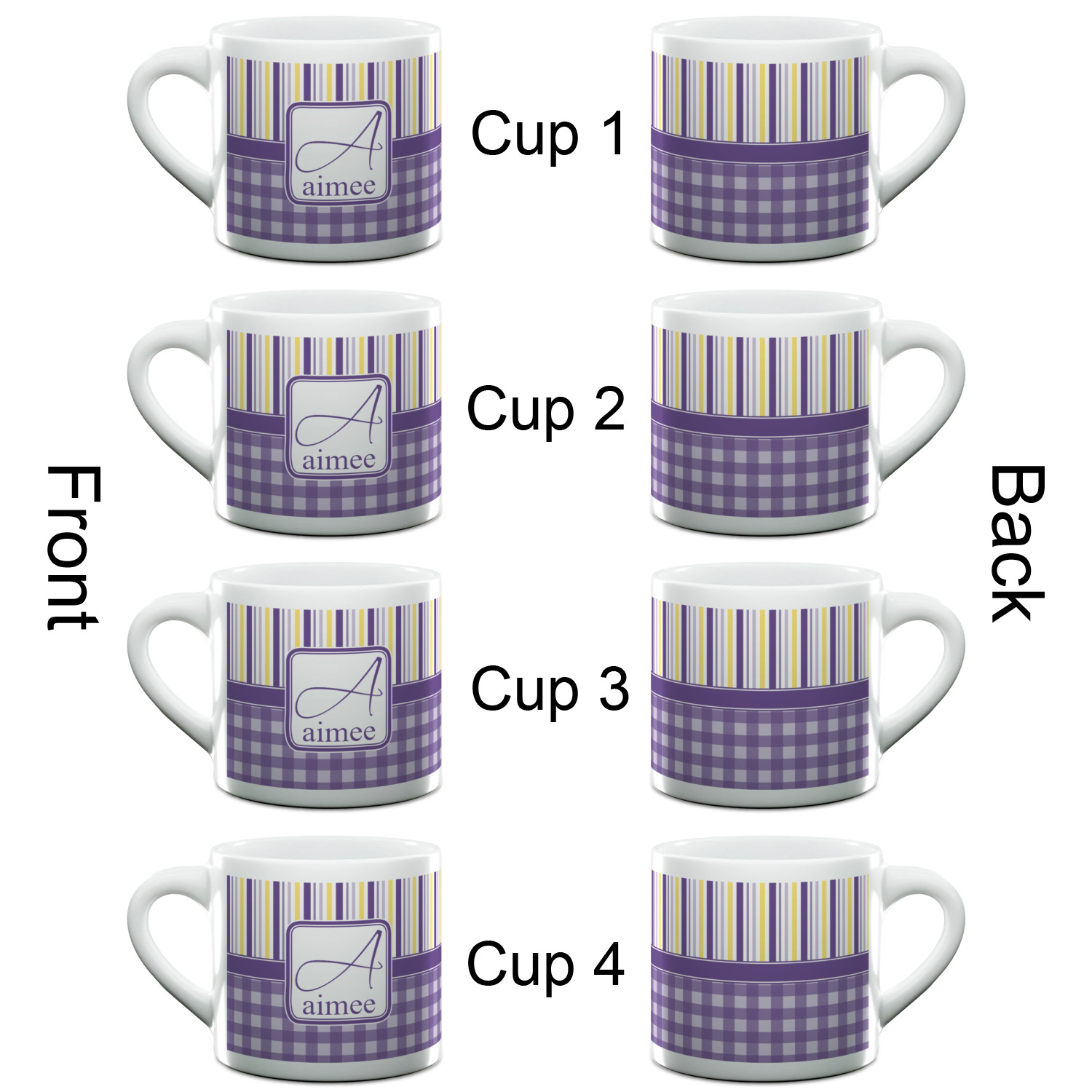 Each of our espresso mugs is a ceramic material sure to keep your drink warm. Personalize one cup for yourself, or order a set of 4! Its the perfect little gift for any coffee lover! We carry two sizes for you to personalize - 3 oz. (approx. 3.25" x 2.325" x 2.625") or 6 oz. (approx. 4" x 2.9" x 2.9"). Our 3 oz. mug is perfect for that single shot espresso while our 6 oz. mug can be your next favorite cappuccino cup holding two shots of espresso!