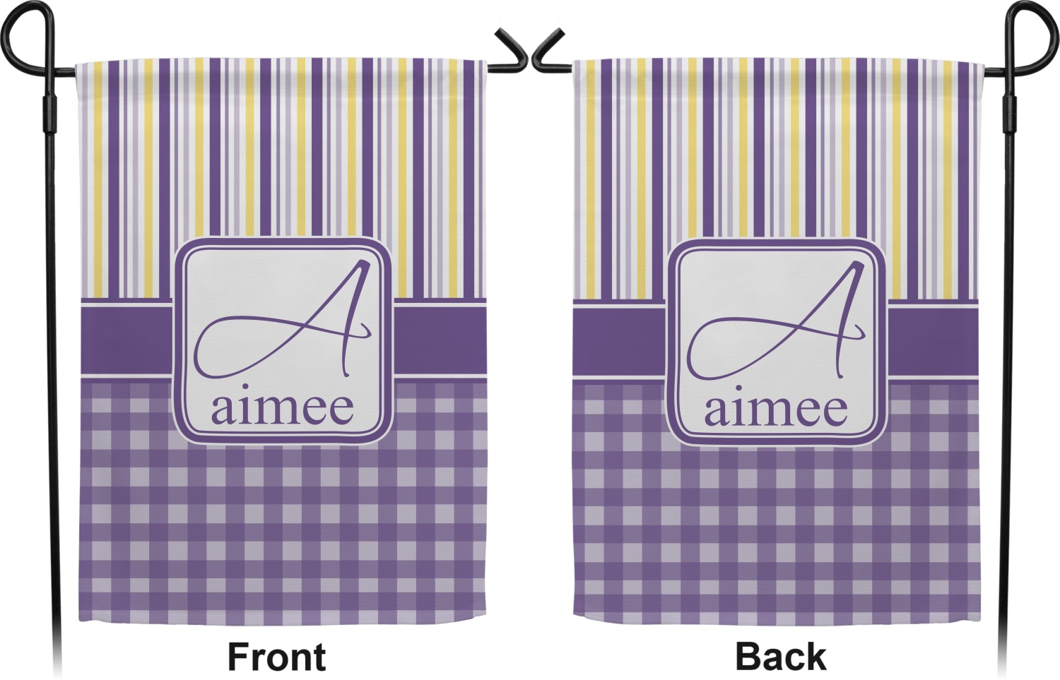 These custom garden flags are made of a durable, double-ply, polyester weave, allowing them to withstand the elements year round. The small flags measure at approximately 12 by 18 inches. The large flags measure out to 28 by 37 inches. You can order these decorative flags with your customization printed on the front only, or the front and back.
