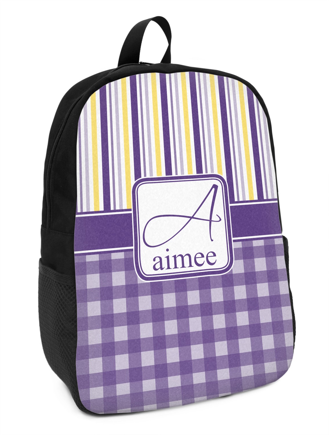 These small backpacks are made of a durable black canvas material with your personalization right on the front. The two shoulder straps are padded and easily adjustable. The bag itself measures at about 11" W x 15" H x 5" D. It's the perfect size for elementary aged kids or adults who want a smaller backpack. On the top of the bag you will find a handle to hang or carry your backpack by as well as a large zipper closure to keep all of your belongings safe inside. On each side of your backpack is a mesh pocket for a small item or water bottle. Inside your backpack you will find a spacious area with a small zipper pocket and a padded laptop slot that will fit up to a 13" laptop (13" being very snug). This is the perfect bag for any student that needs a couple books and their laptop with them at all times. It also works great as a carry on for traveling!