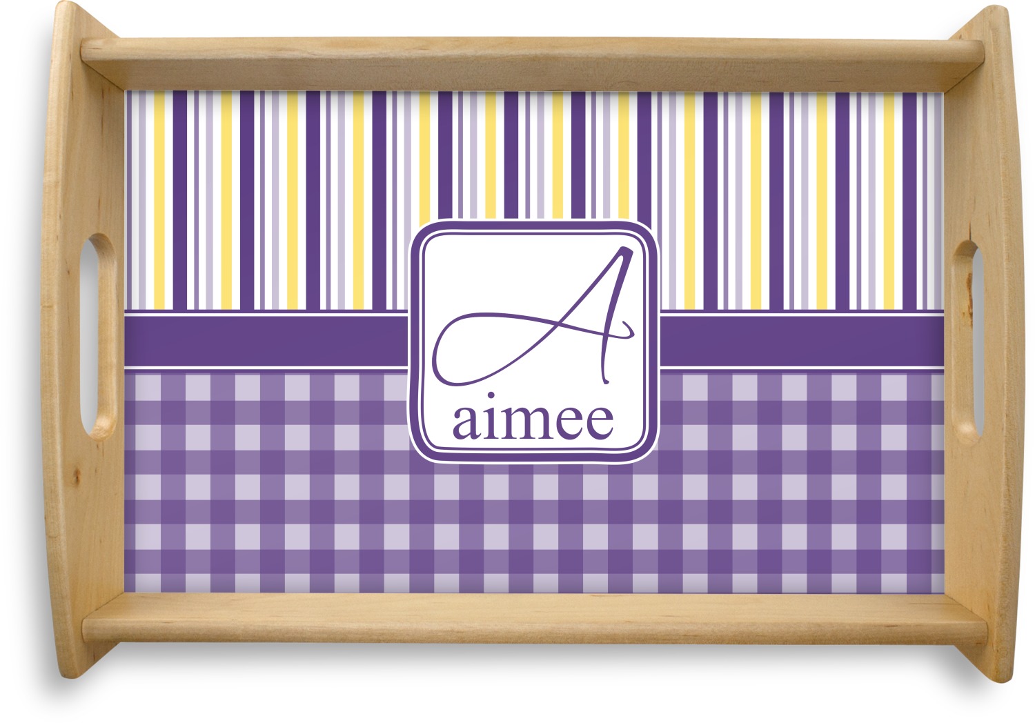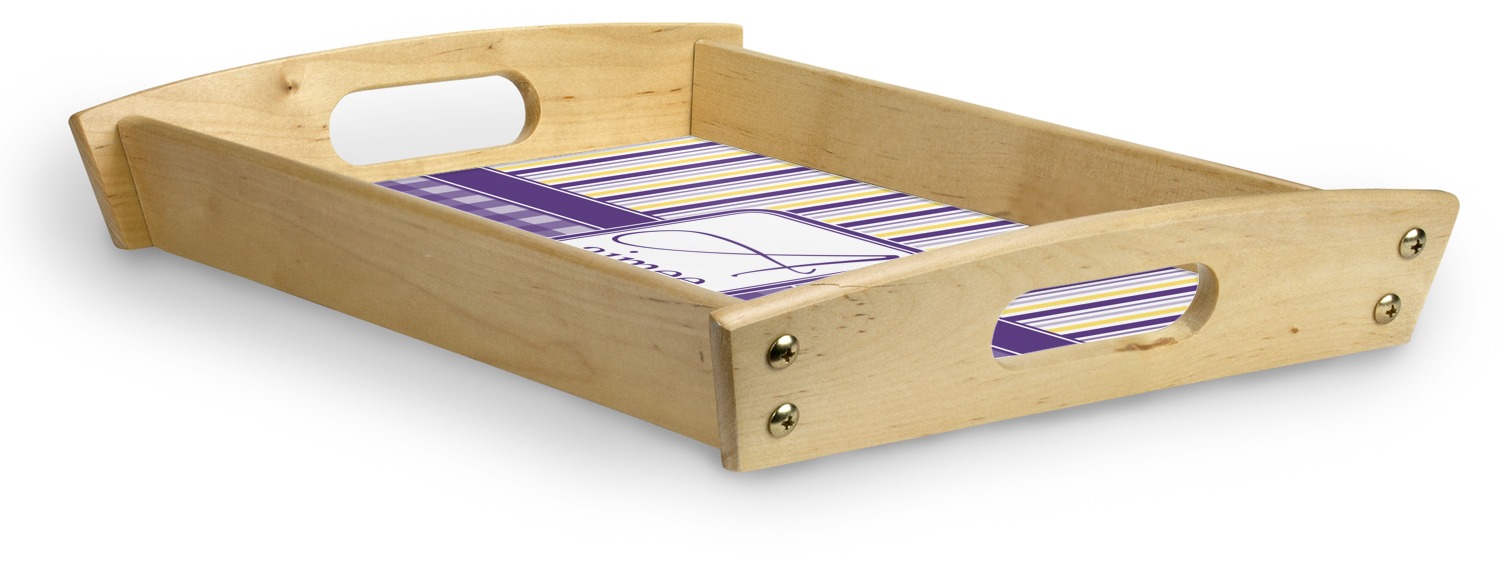 This serving tray with handles features square edges and two rounded sides, creating a very modern look. Each side is fabricated from a beautifully cut, natural wood. The bottom of the interior of the tray displays your customized design in bright, vibrant color. The tray is sold in both a black color and a natural wood look. Each variation of the wood serving tray has two sizes: Small, which is 14" x 10" x 2.25", and Large, which is 19.5" x 13.5" x 2.75".