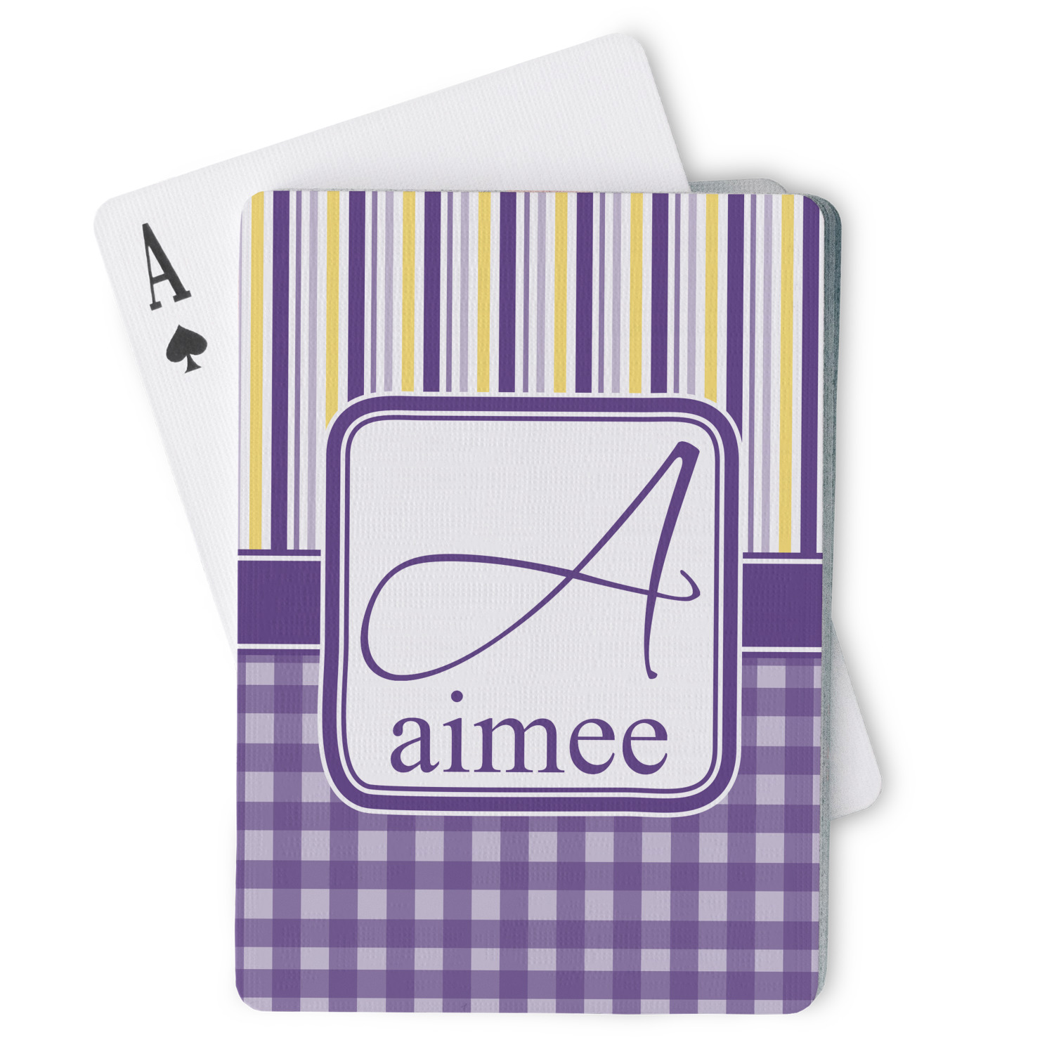 The customization / personalization is printed on the back side. The playing cards have a low gloss coating on both sides. The cards are packaged in a clear plastic box.