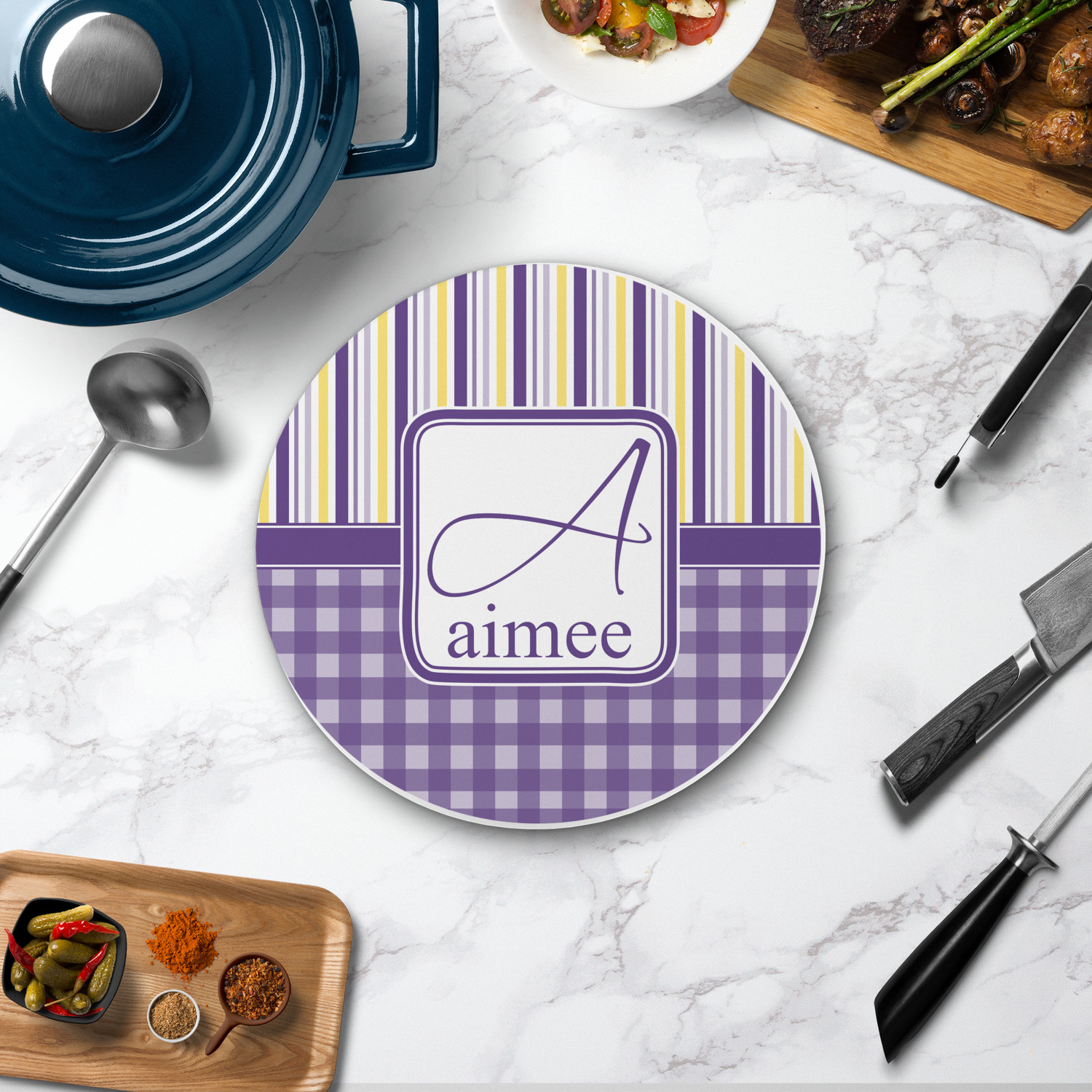 The round trivets can be customized with your own design, your own photo, or your own logo. You can add personalization, like a monogram, family name or initial to your uploaded design / art. You can also customize one of our designs and change the patterns, colors, personalization, fonts etc.