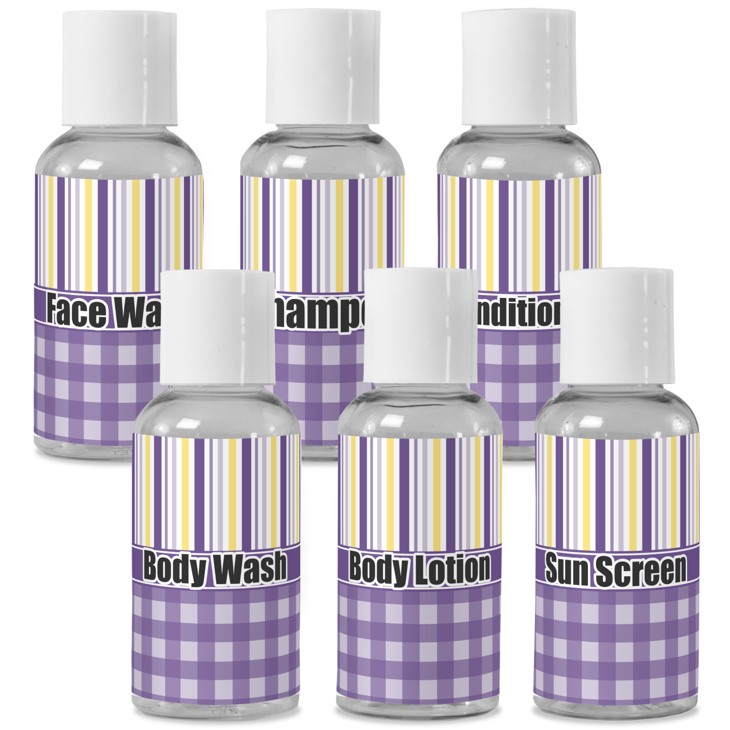 These soap and lotion travel bottles are the perfect place to start. Each set comes with 6 clear plastic bottles with white pop top lids. The bottles are cylindrical and can hold approximately 2.7oz. Perfect for plane travel!
