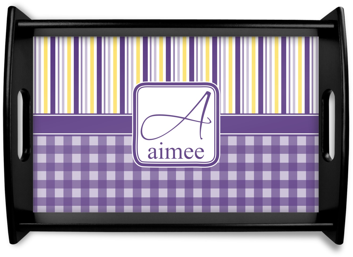This serving tray with handles features square edges and two rounded sides, creating a very modern look. Each side is fabricated from a beautifully cut, natural wood. The bottom of the interior of the tray displays your customized design in bright, vibrant color. The tray is sold in both a black color and a natural wood look. Each variation of the wood serving tray has two sizes: Small, which is 14" x 10" x 2.25", and Large, which is 19.5" x 13.5" x 2.75".