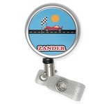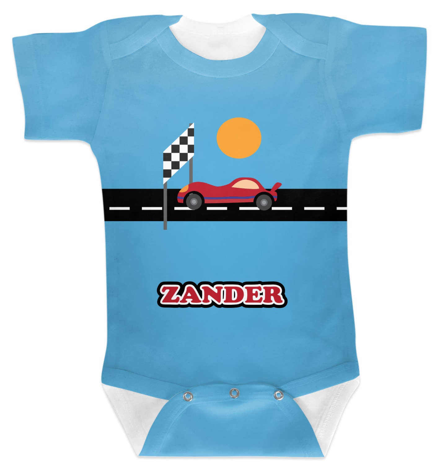 Does your little guy dream of being a race car driver? Make his eyes light up with his very own race car! Our fun red race car is on the track and heading for 1st place under the checkered banner. The car scene is set on a beautiful blue background with the bright sun looking down.