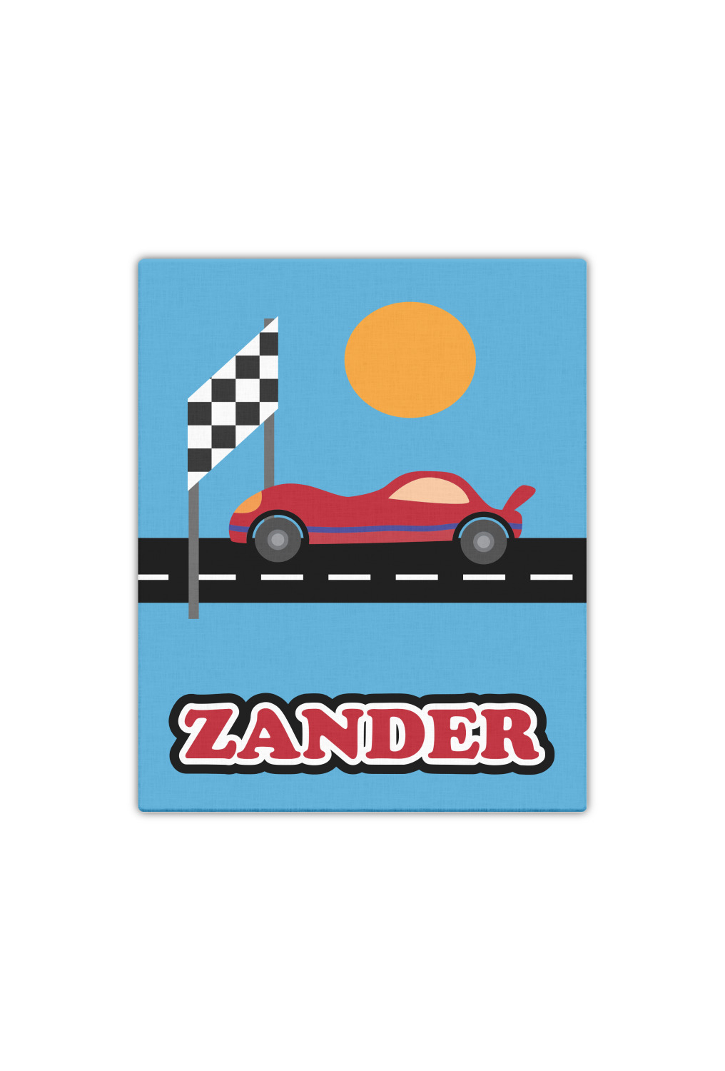 Does your little guy dream of being a race car driver? Make his eyes light up with his very own race car! Our fun red race car is on the track and heading for 1st place under the checkered banner. The car scene is set on a beautiful blue background with the bright sun looking down.
