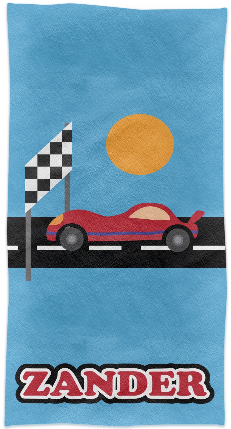 Does your little guy dream of being a race car driver? Make his eyes light up with his very own race car! Our fun red race car is on the track and heading for 1st place under the checkered banner. The car scene is set on a beautiful blue background with the bright sun looking down.