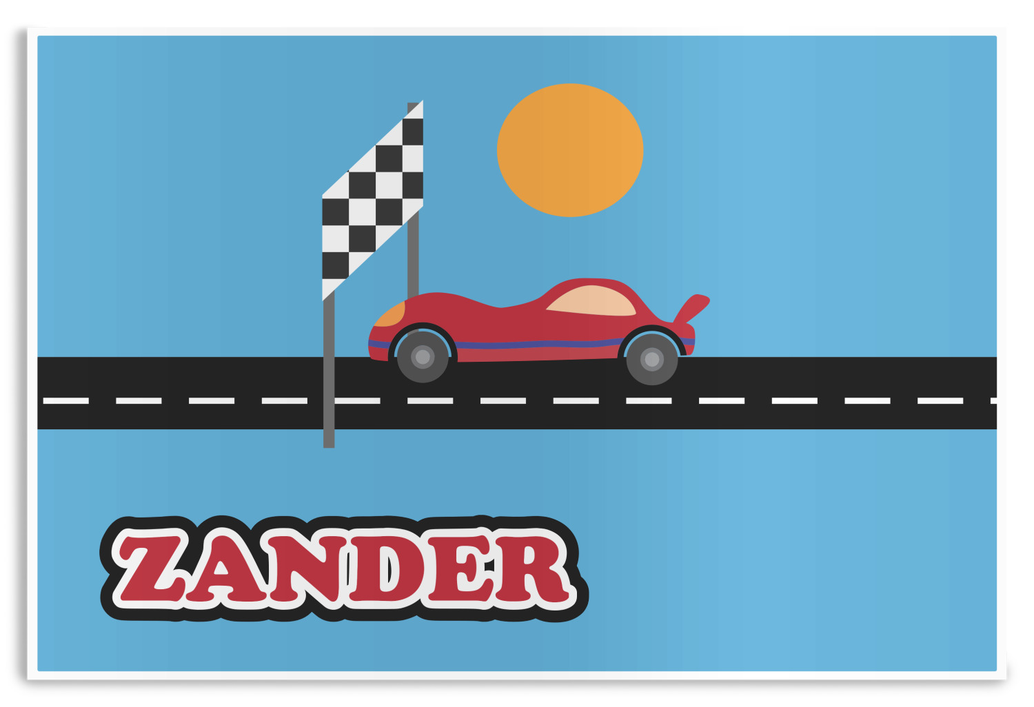Does your little guy dream of being a race car driver? Make his eyes light up with his very own race car! Our fun red race car is on the track and heading for 1st place under the checkered banner. The car scene is set on a beautiful blue background with the bright sun looking down.