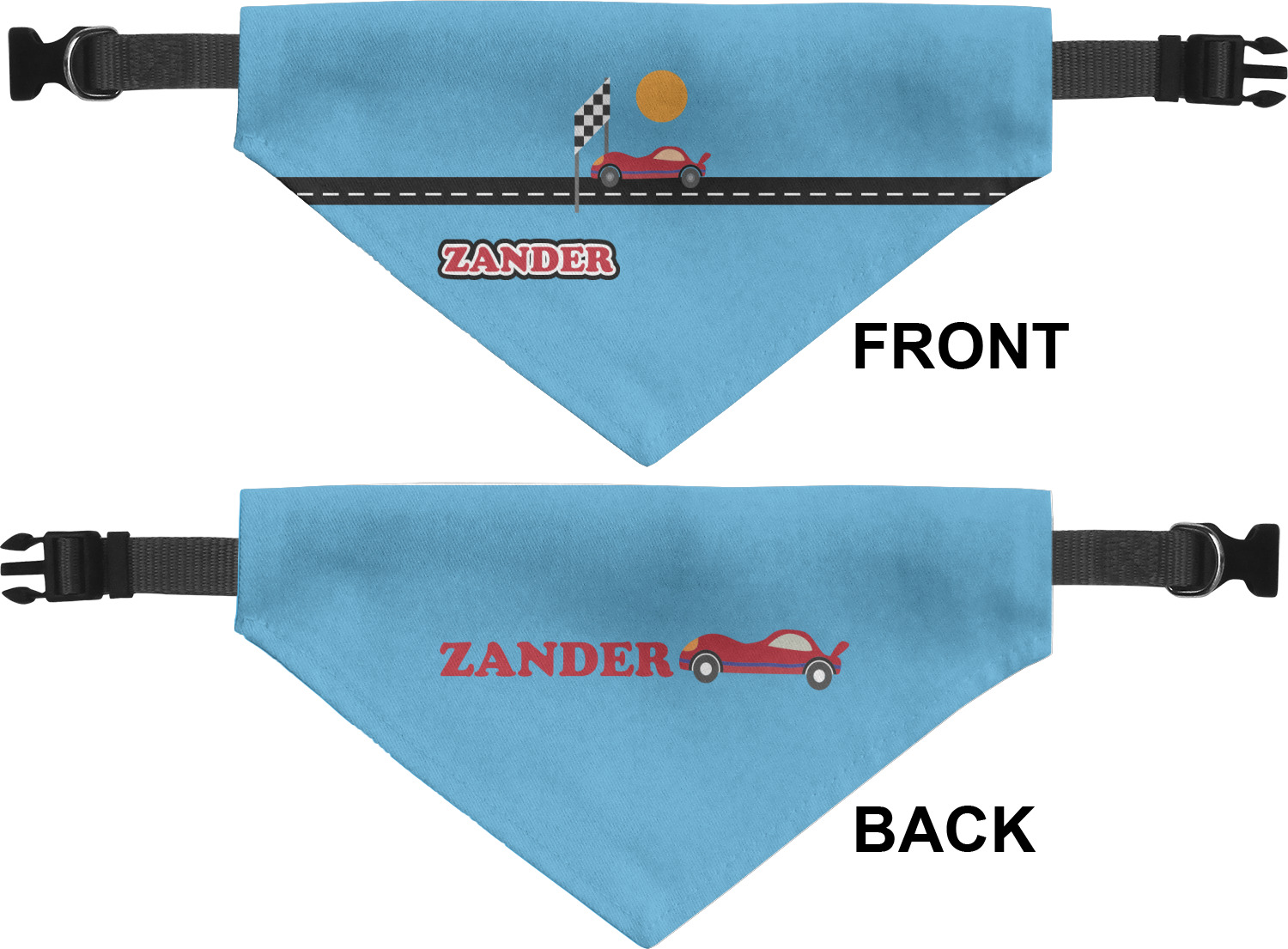 We print the front and back of these dog bandanas with your customized design. The bandana itself is made from a durable polyester, sewn together with a gap large enough to accommodate any collar. Regardless, the bandana includes a plain black, canvas collar with plastic snaps, that can easily be removed if desired. These dog bandana collars are available in four sizes: small, medium, large, and extra large. Please see our sizing chart for more information regarding the dimensions of each size.