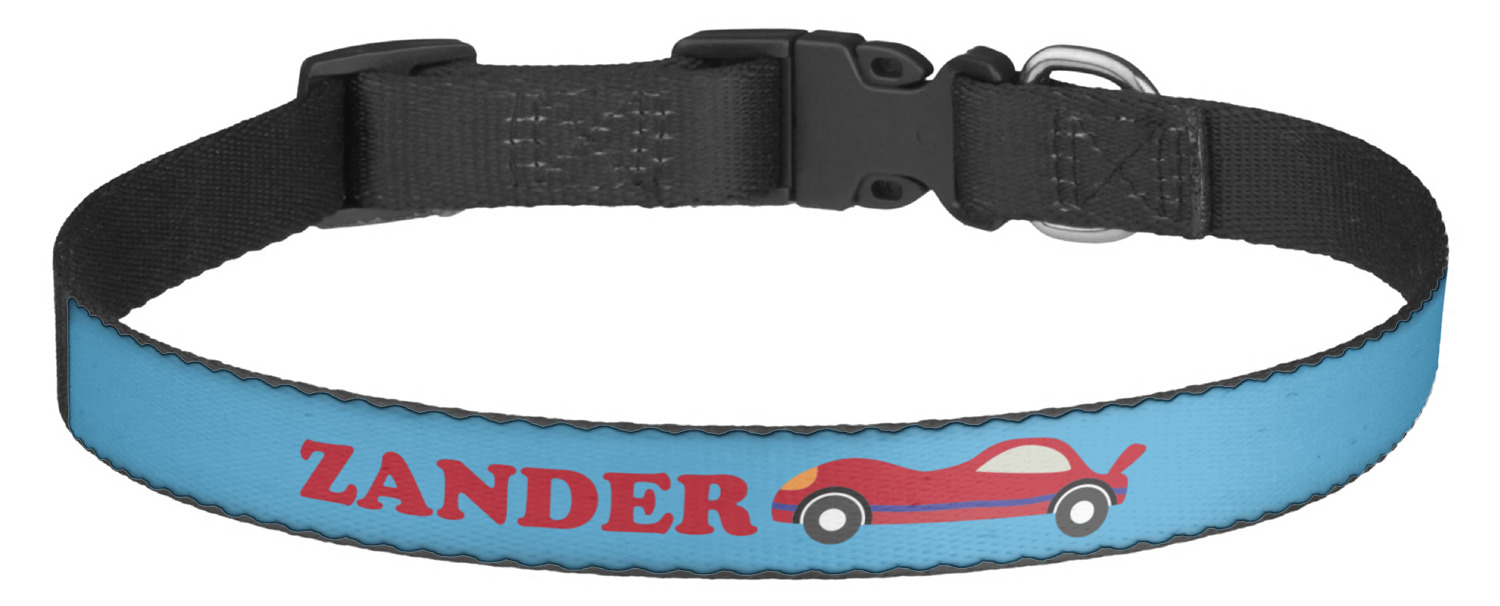 This sturdy collar, made from a durable nylon weave, will outlive your dog's episodes of excited tugging and pulling. Courtesy of its thick plastic buckle and adjuster, this collar is adjustable and accommodating of any dog. Structurally, the collar is a single piece of nylon weave that is sewn together, and features a solid metal loop where you can attach a leash or dog tag. We print and display your dog's name and pattern across the middle of the personalized dog collar.