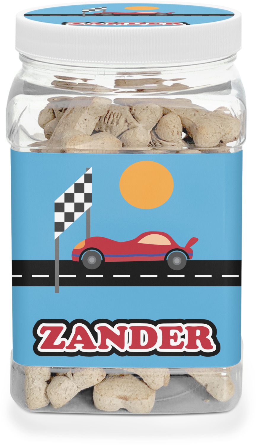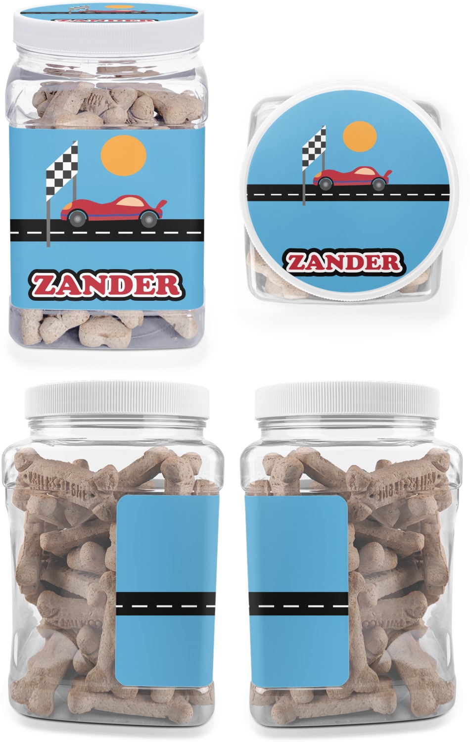This half gallon jar, made from a sturdy plastic, is the perfect way to keep treats from any naughty pet paws, while still keeping them ready on hand for when your pup performs an impressive trick. This dog cookie jar features a screw-on, white lid that displays your personalized design on a vinyl sticker. We apply another customized sticker that wraps around the front and sides of the jar. Our dog treat jar also has indentations on the rear ends of the sides, which allows for convenient handling, and its square frame allows for easy storage.