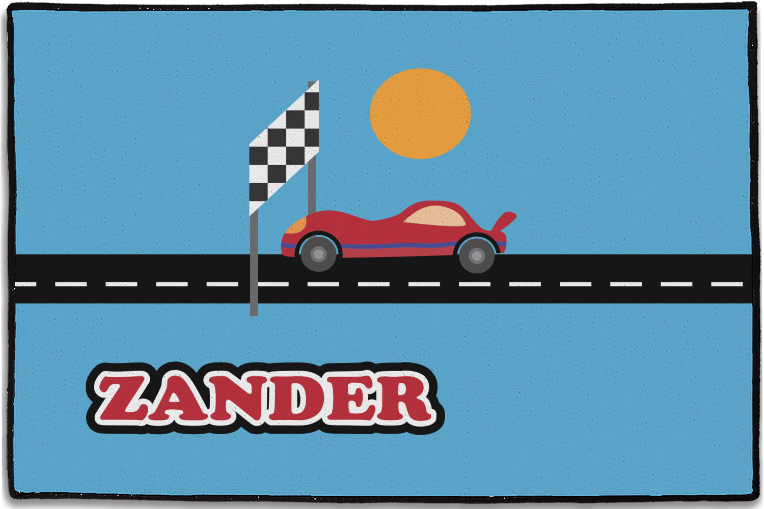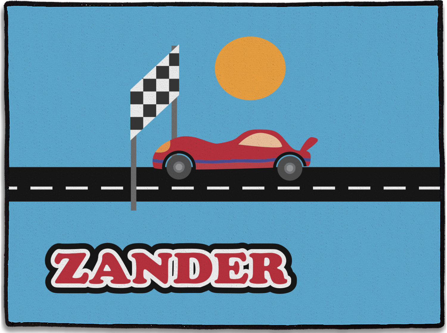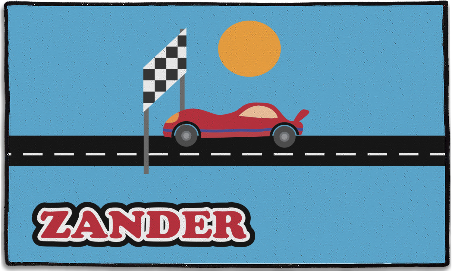 Does your little guy dream of being a race car driver? Make his eyes light up with his very own race car! Our fun red race car is on the track and heading for 1st place under the checkered banner. The car scene is set on a beautiful blue background with the bright sun looking down.