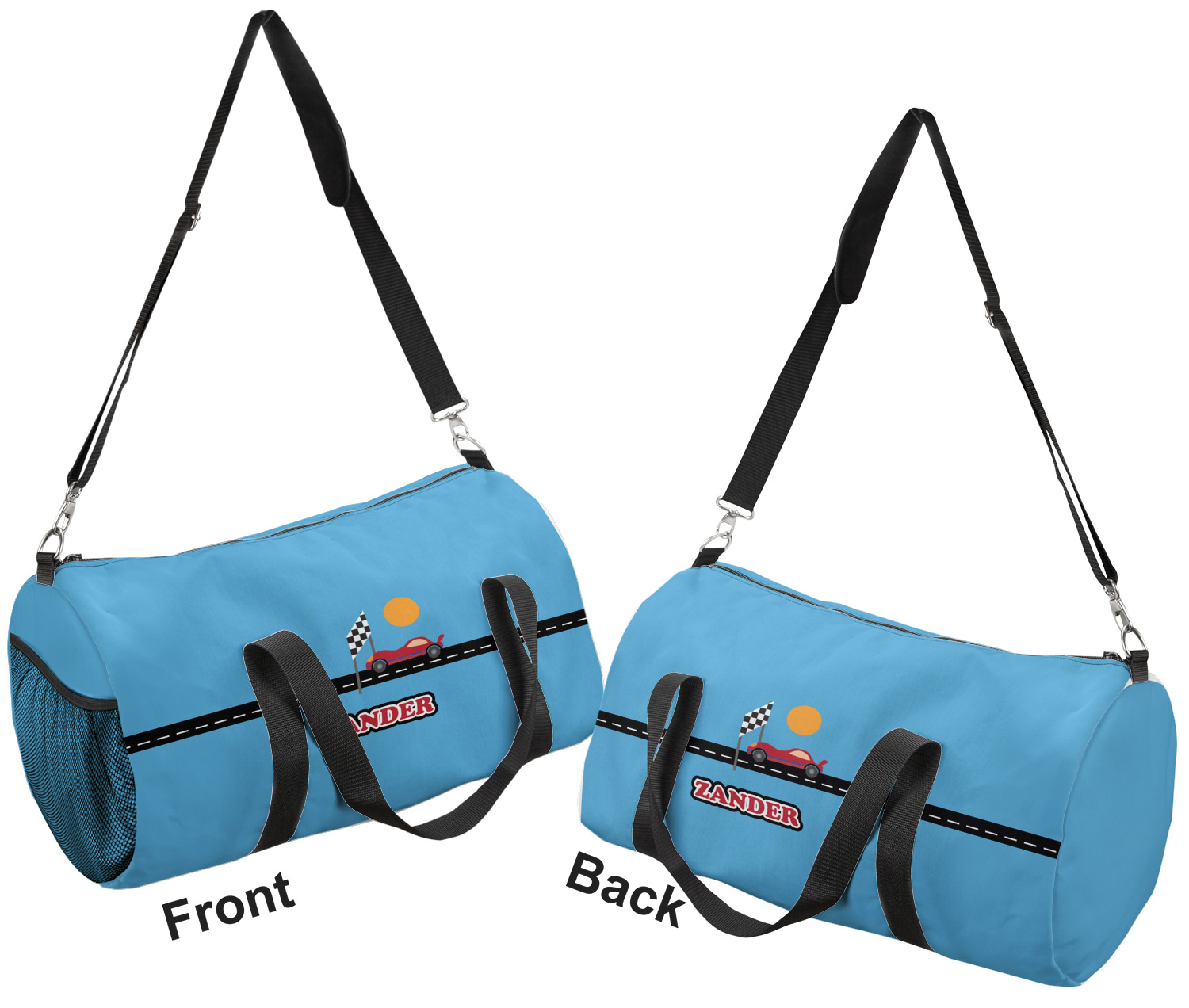 This duffle is a sturdy bag made of a canvas material. It comes in two sizes: Small (19"W x 9.5"H x 9.5"D) and Large (23"W x 12"H x 12"D). The bag is a cylindrical shape with a black adjustable strap and two handles. On one side is an elastic pouch to put a waterbottle or other small item. Your product will be sublimated with your design and is able to be designed on the front, back, and sides. Be sure to remember that the straps may cut into parts of your design if you upload your own artwork.