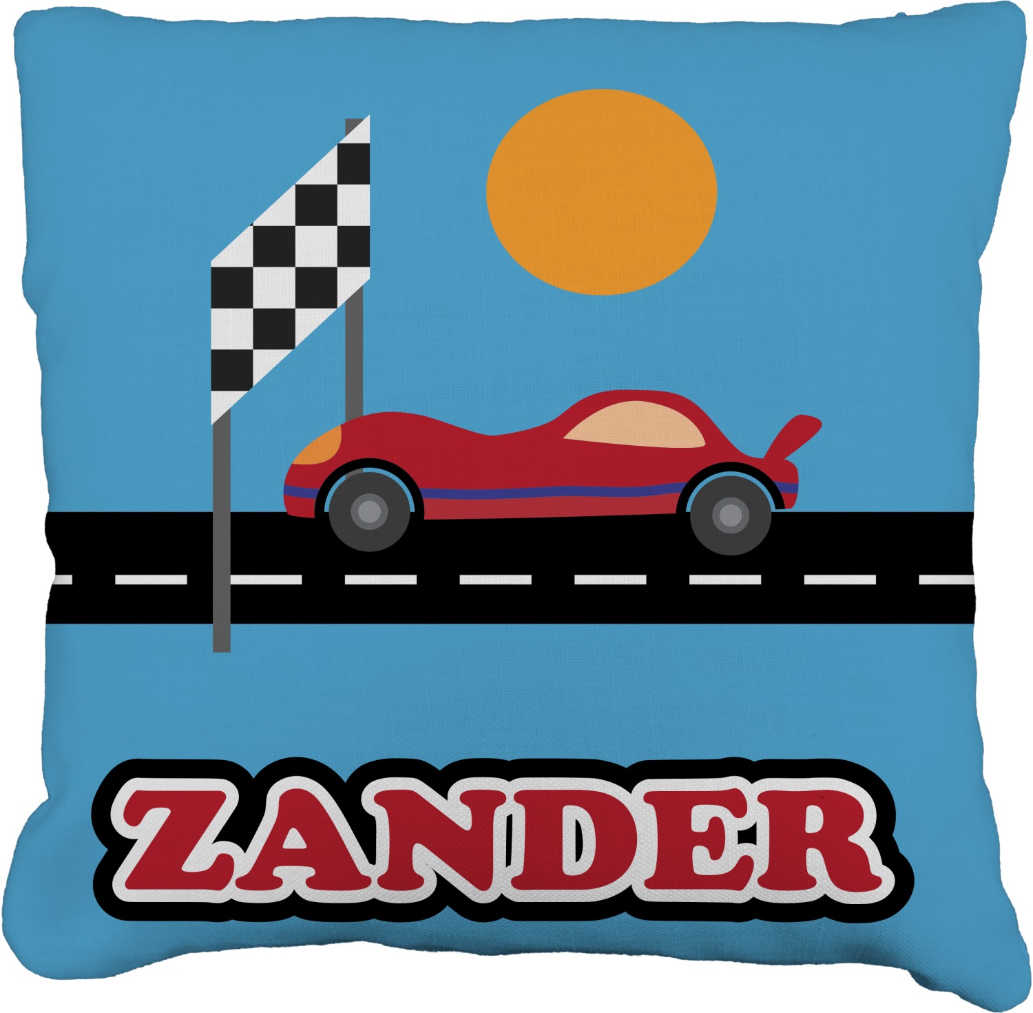 Does your little guy dream of being a race car driver? Make his eyes light up with his very own race car! Our fun red race car is on the track and heading for 1st place under the checkered banner. The car scene is set on a beautiful blue background with the bright sun looking down.