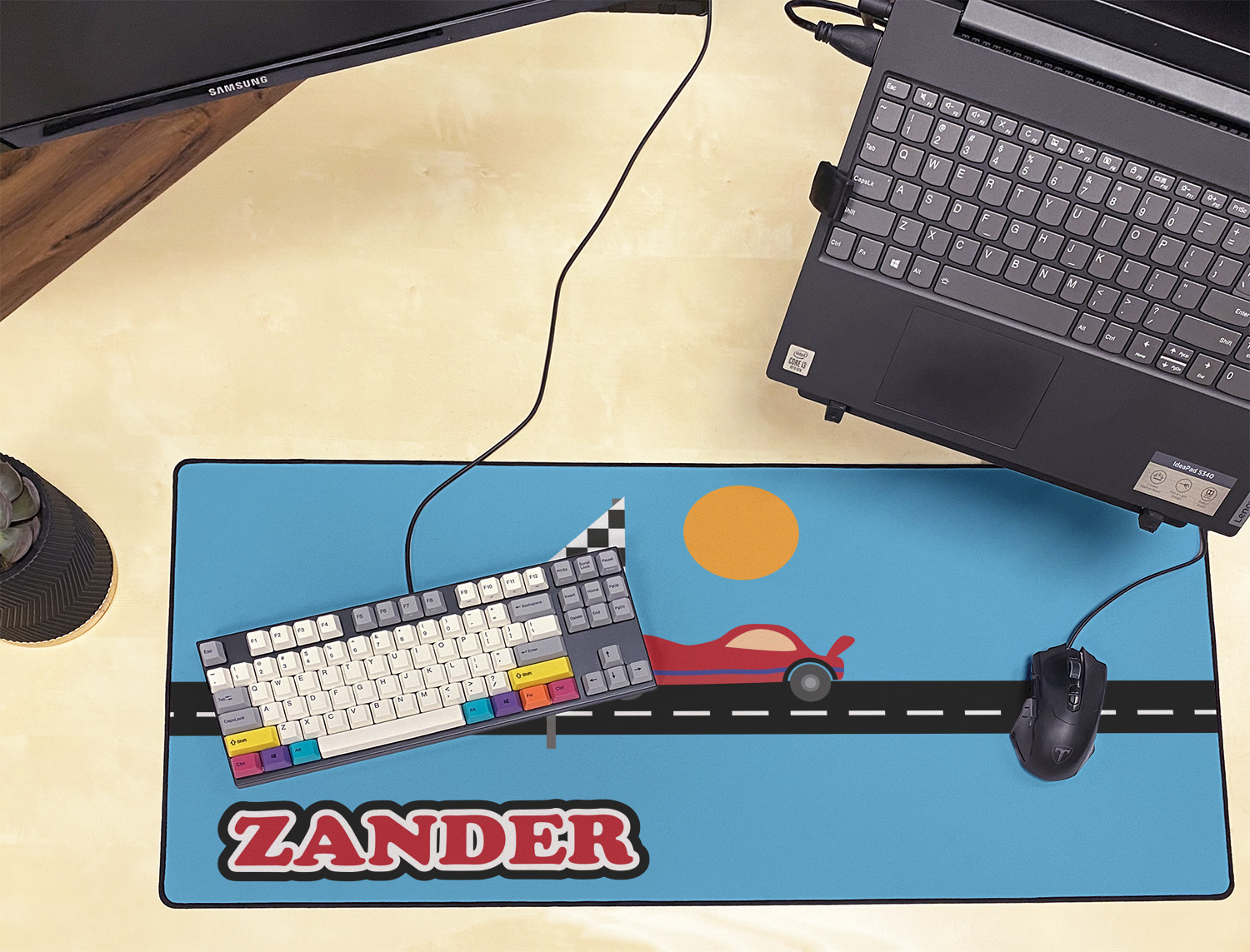 Does your little guy dream of being a race car driver? Make his eyes light up with his very own race car! Our fun red race car is on the track and heading for 1st place under the checkered banner. The car scene is set on a beautiful blue background with the bright sun looking down.
