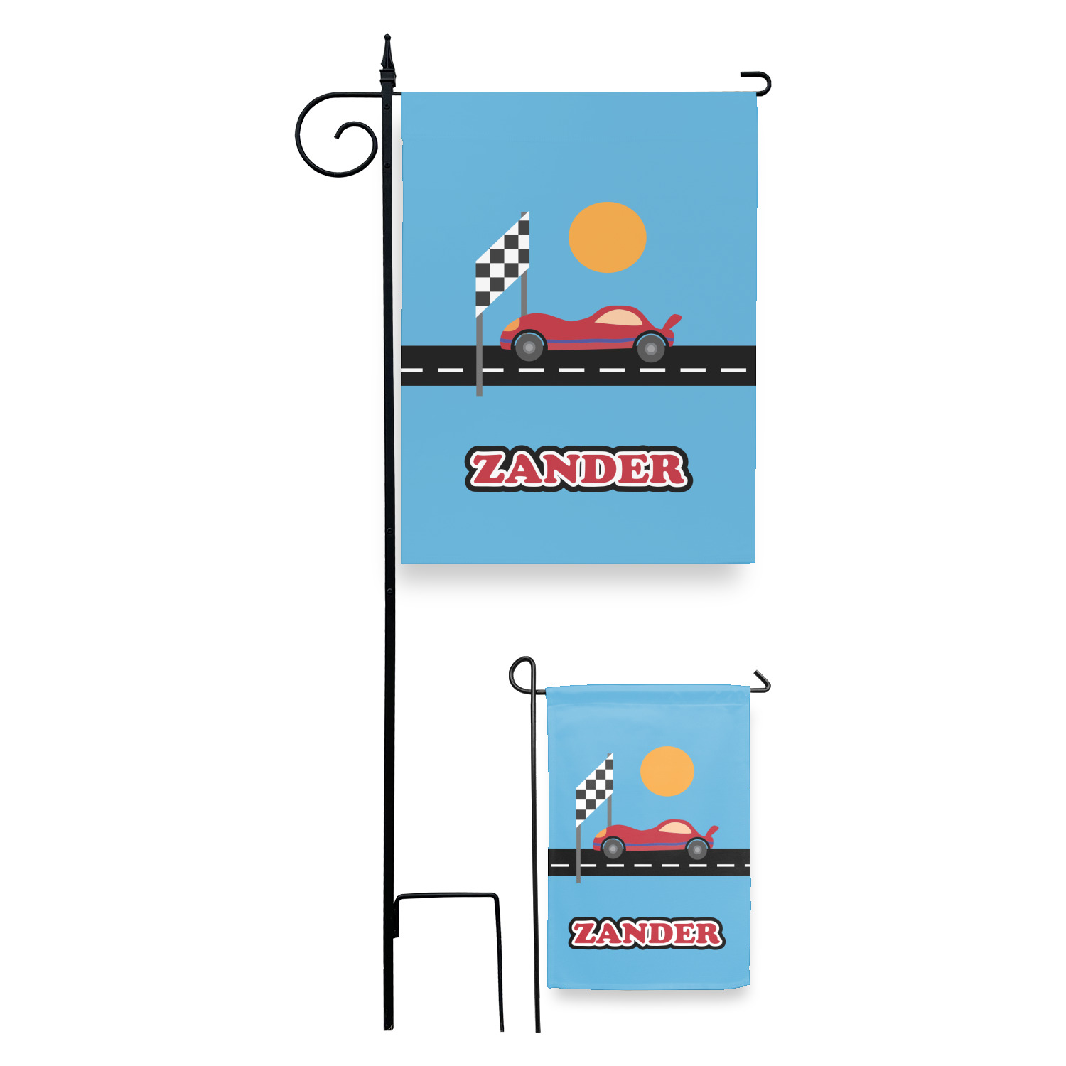 Does your little guy dream of being a race car driver? Make his eyes light up with his very own race car! Our fun red race car is on the track and heading for 1st place under the checkered banner. The car scene is set on a beautiful blue background with the bright sun looking down.