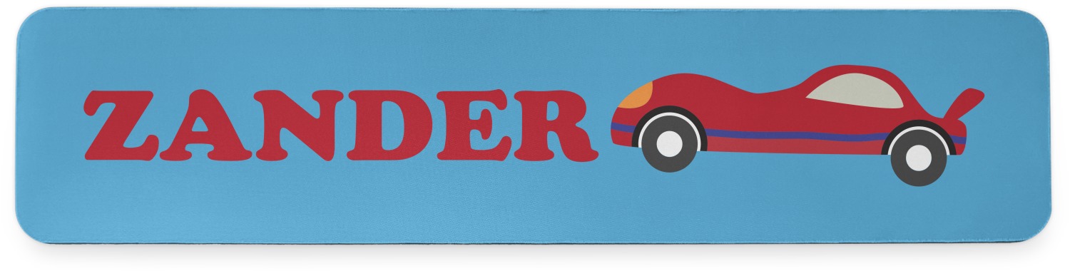 Does your little guy dream of being a race car driver? Make his eyes light up with his very own race car! Our fun red race car is on the track and heading for 1st place under the checkered banner. The car scene is set on a beautiful blue background with the bright sun looking down.