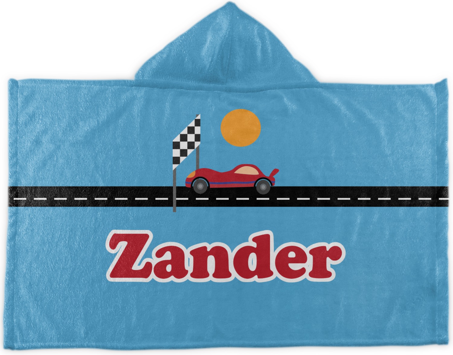 Does your little guy dream of being a race car driver? Make his eyes light up with his very own race car! Our fun red race car is on the track and heading for 1st place under the checkered banner. The car scene is set on a beautiful blue background with the bright sun looking down.