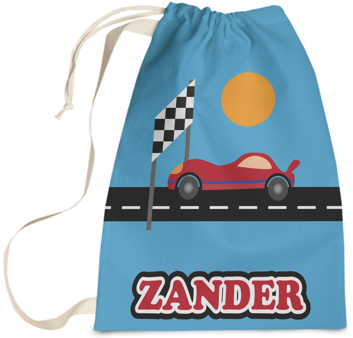 Does your little guy dream of being a race car driver? Make his eyes light up with his very own race car! Our fun red race car is on the track and heading for 1st place under the checkered banner. The car scene is set on a beautiful blue background with the bright sun looking down.