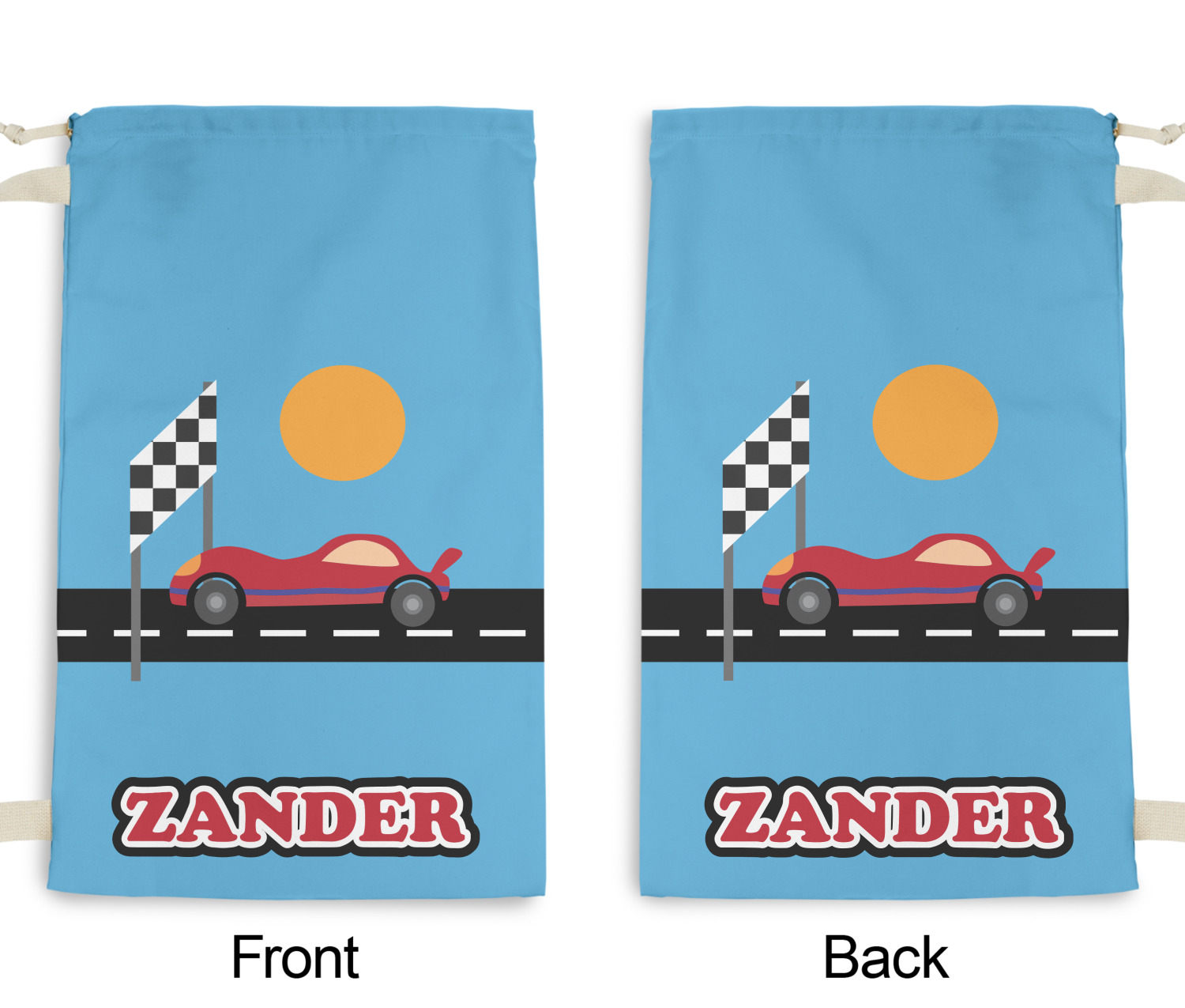 Does your little guy dream of being a race car driver? Make his eyes light up with his very own race car! Our fun red race car is on the track and heading for 1st place under the checkered banner. The car scene is set on a beautiful blue background with the bright sun looking down.