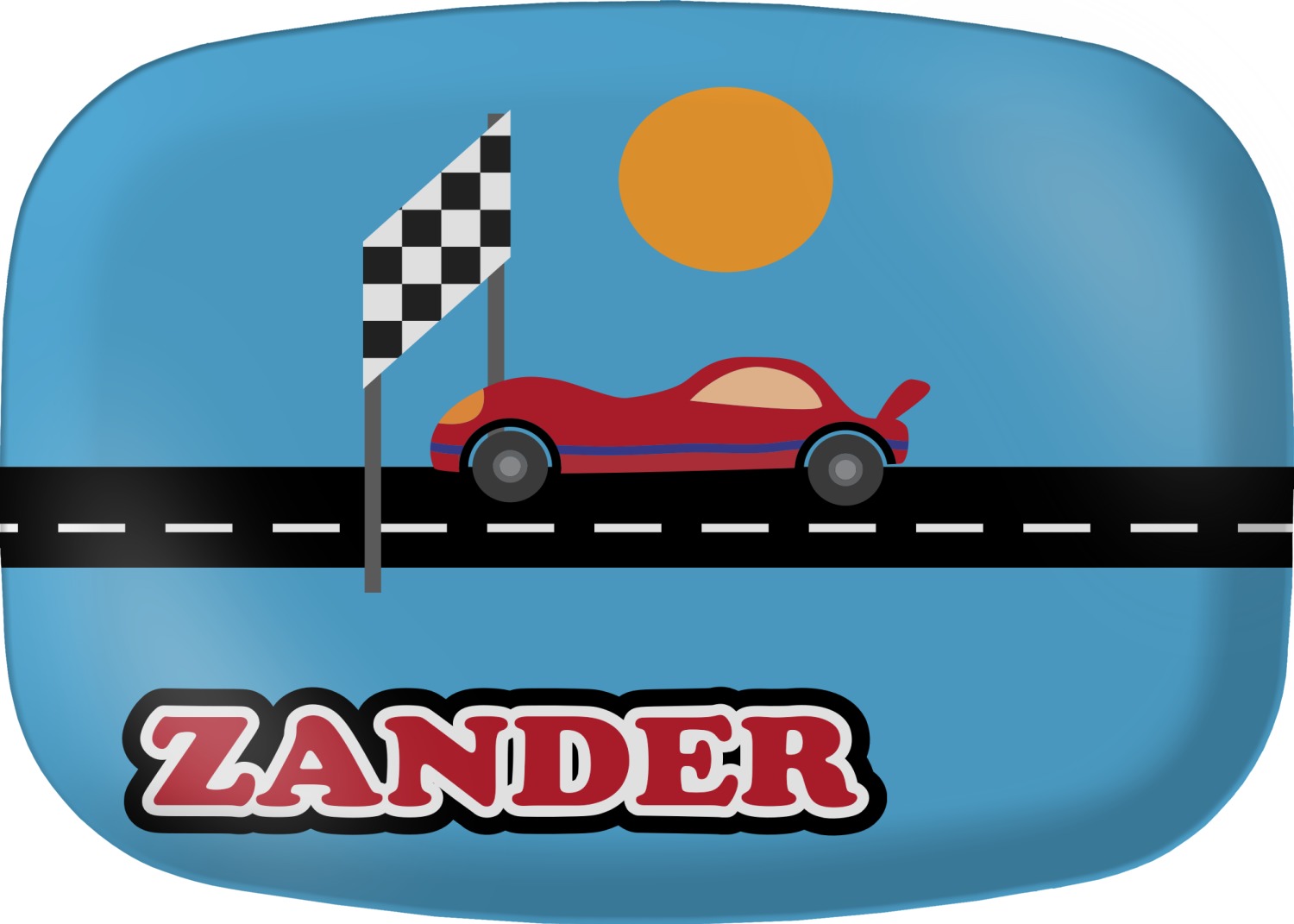Does your little guy dream of being a race car driver? Make his eyes light up with his very own race car! Our fun red race car is on the track and heading for 1st place under the checkered banner. The car scene is set on a beautiful blue background with the bright sun looking down.