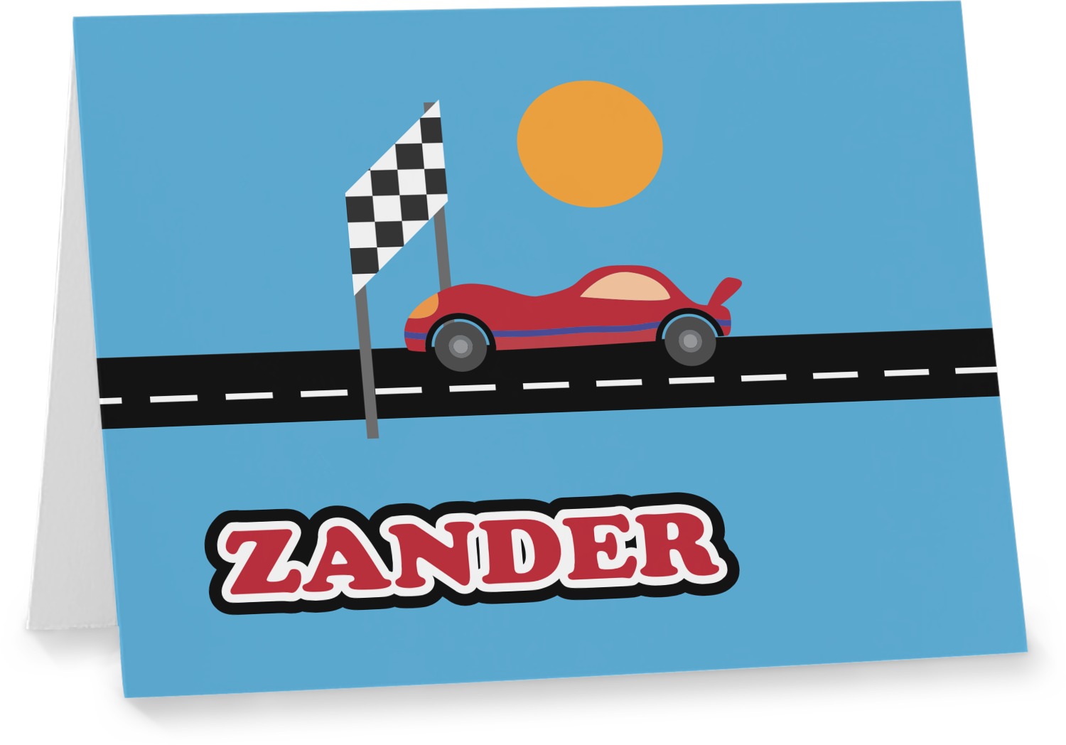 Does your little guy dream of being a race car driver? Make his eyes light up with his very own race car! Our fun red race car is on the track and heading for 1st place under the checkered banner. The car scene is set on a beautiful blue background with the bright sun looking down.