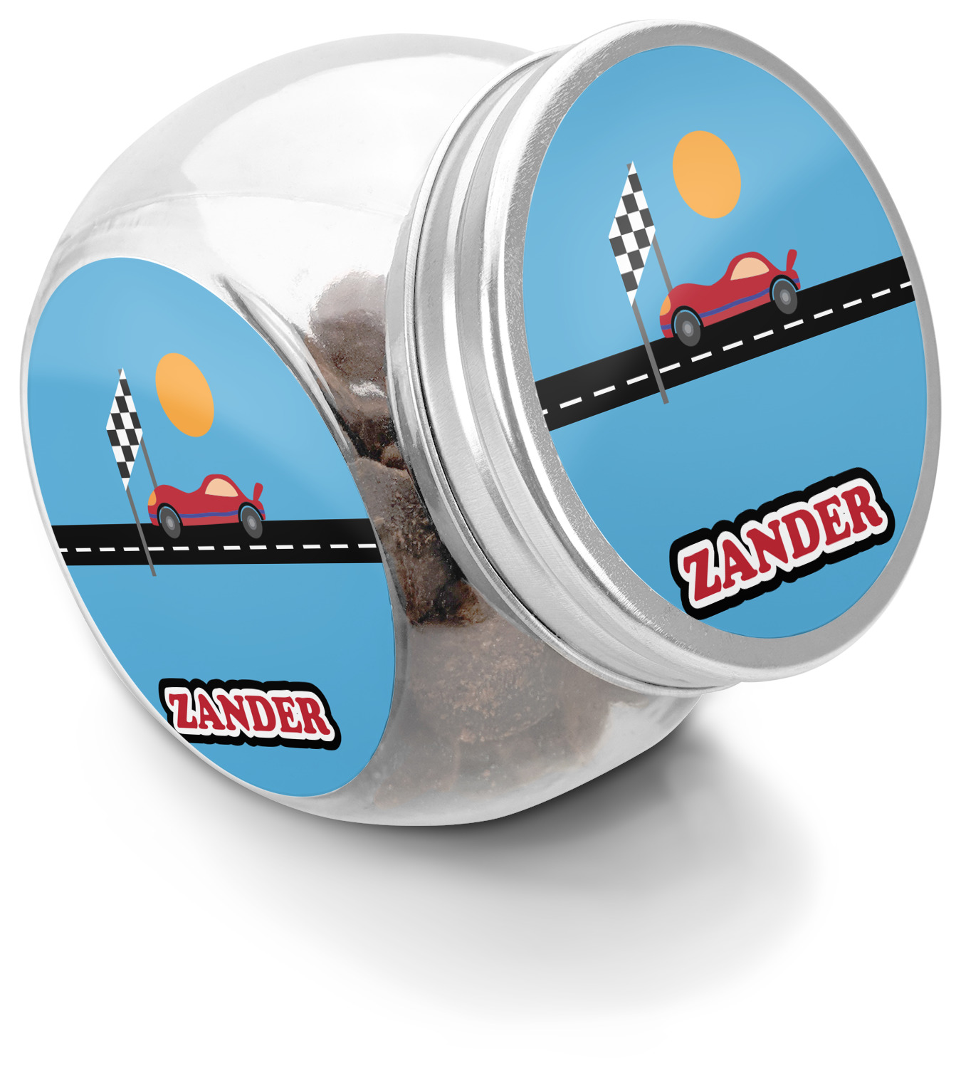 This treat jar is an excellent way to store treats for your favorite canine or feline. Moreover, their delicate, classy appearance makes them a tasteful addition to your countertop's décor. Crafted from clear glass, its unique construction and silver metal, screw-on lid allows for quick and easy access. Three, permanent, vinyl stickers are applied to both sides of the jar and lid, presenting your personalized design. The base of this glass, dog treat jar is 3.4" x 4.75", and the jar stands at 5" tall. Though on the smaller side, this jar is best suited for smaller treats or training treats.