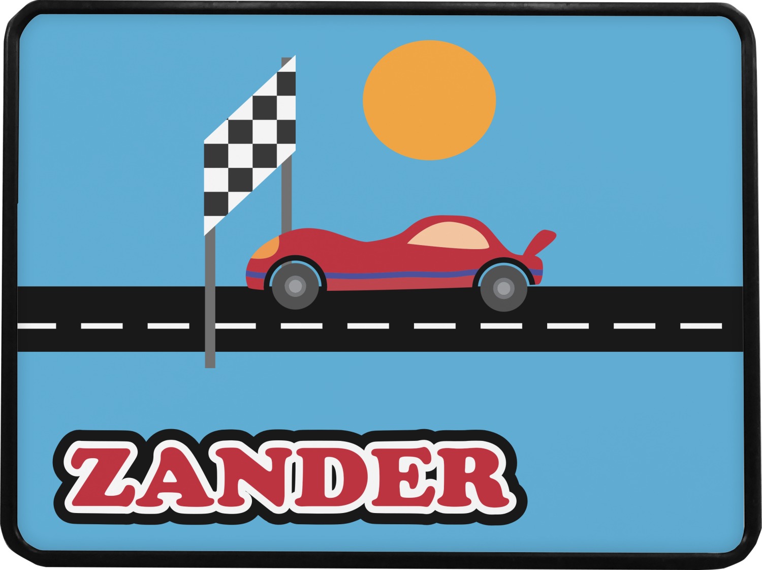 Does your little guy dream of being a race car driver? Make his eyes light up with his very own race car! Our fun red race car is on the track and heading for 1st place under the checkered banner. The car scene is set on a beautiful blue background with the bright sun looking down.