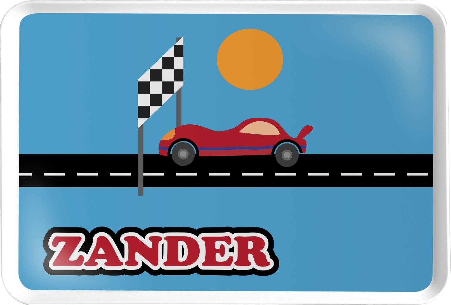 Does your little guy dream of being a race car driver? Make his eyes light up with his very own race car! Our fun red race car is on the track and heading for 1st place under the checkered banner. The car scene is set on a beautiful blue background with the bright sun looking down.