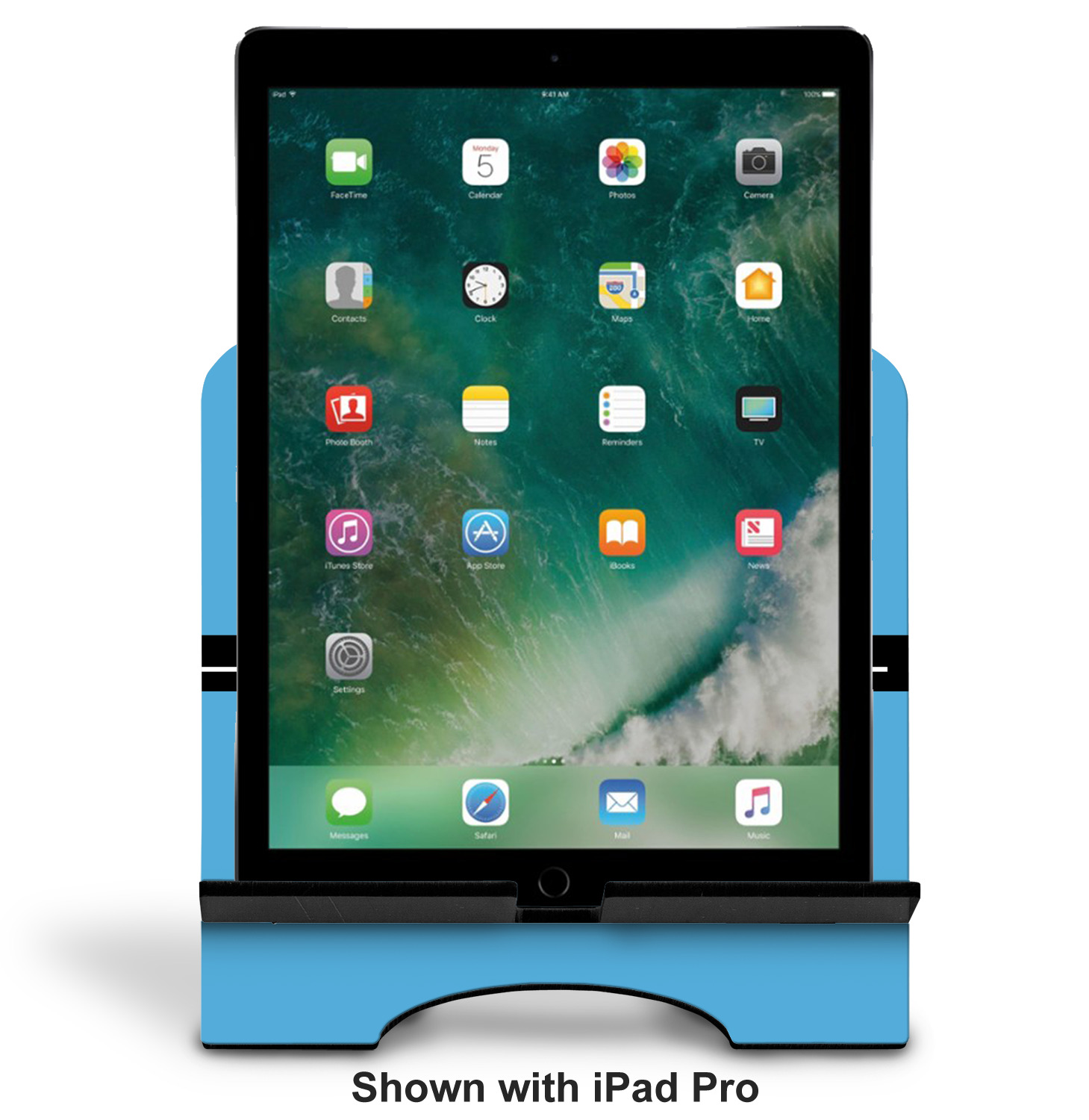 The stand is comprised of two hardboard pieces that fit snugly together and stabilize one another. The bottom part of the iPad stand supports your tablet, and has space for your tablets charger while in use. At 9.25" x 11.5", this tablet mount can support a device between the sizes of the iPad Pro and the iPad Mini 2. The uppermost part of the stand features a decorative, curved edge for a classy, suave appearance. We print your customization atop the face of the stand, in vibrant color. The remaining sides are colored a sleek black.