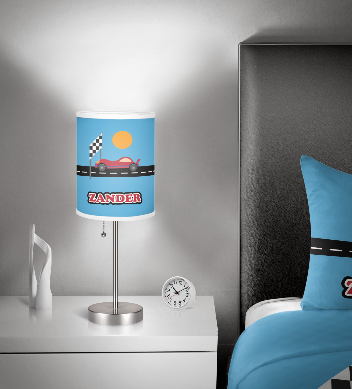 Does your little guy dream of being a race car driver? Make his eyes light up with his very own race car! Our fun red race car is on the track and heading for 1st place under the checkered banner. The car scene is set on a beautiful blue background with the bright sun looking down.