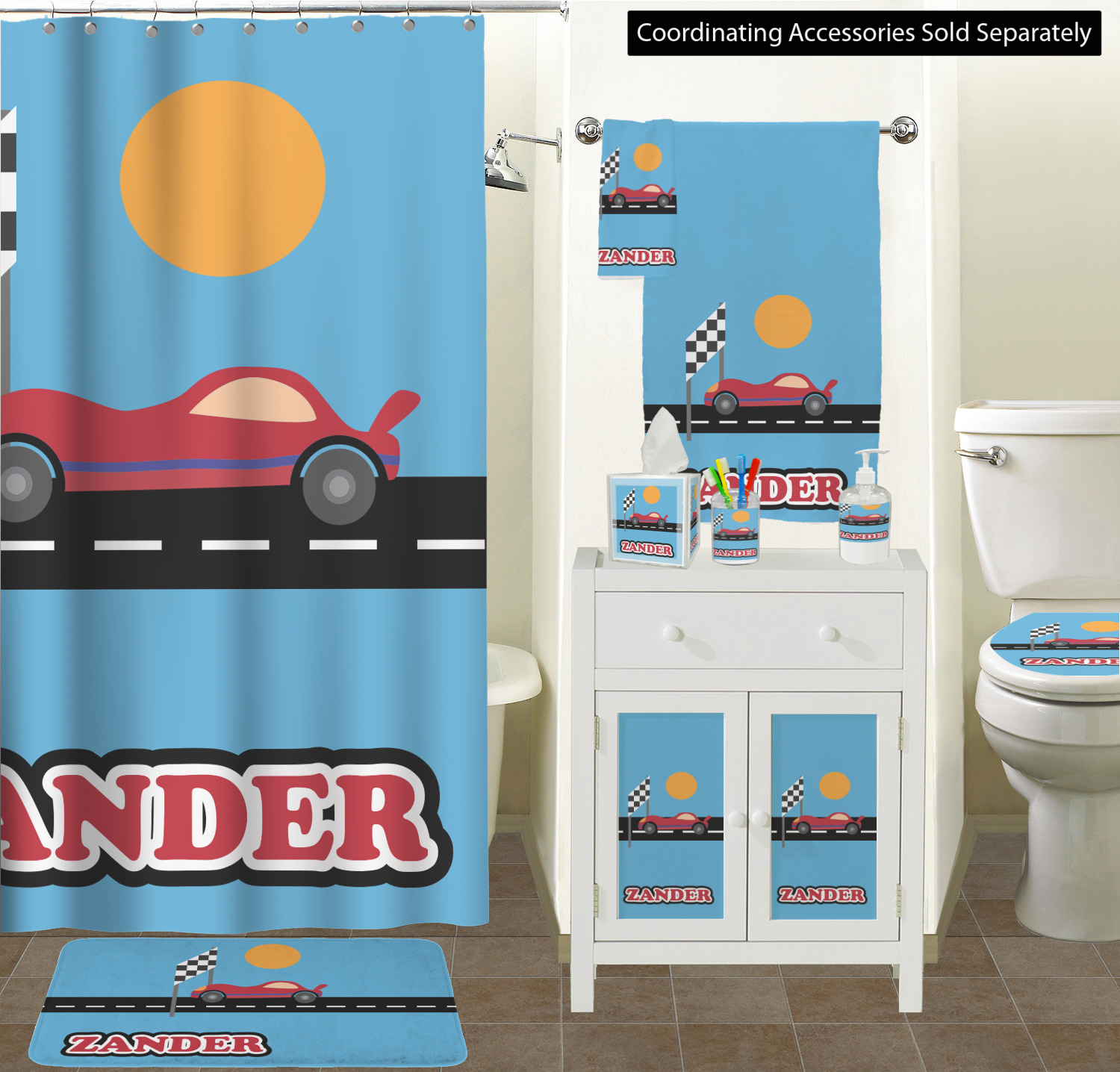 Does your little guy dream of being a race car driver? Make his eyes light up with his very own race car! Our fun red race car is on the track and heading for 1st place under the checkered banner. The car scene is set on a beautiful blue background with the bright sun looking down.