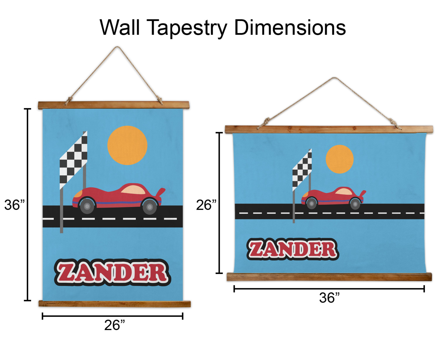Made in two different orientations - portrait or landscape - both are 26" x 36". Your design is printed on a high quality polyester fabric with hemmed edges. The wood on the top and bottom of the tapestry is 1.25" tall and 0.25" thick and there are two pieces on top and bottom which sandwich the fabric.