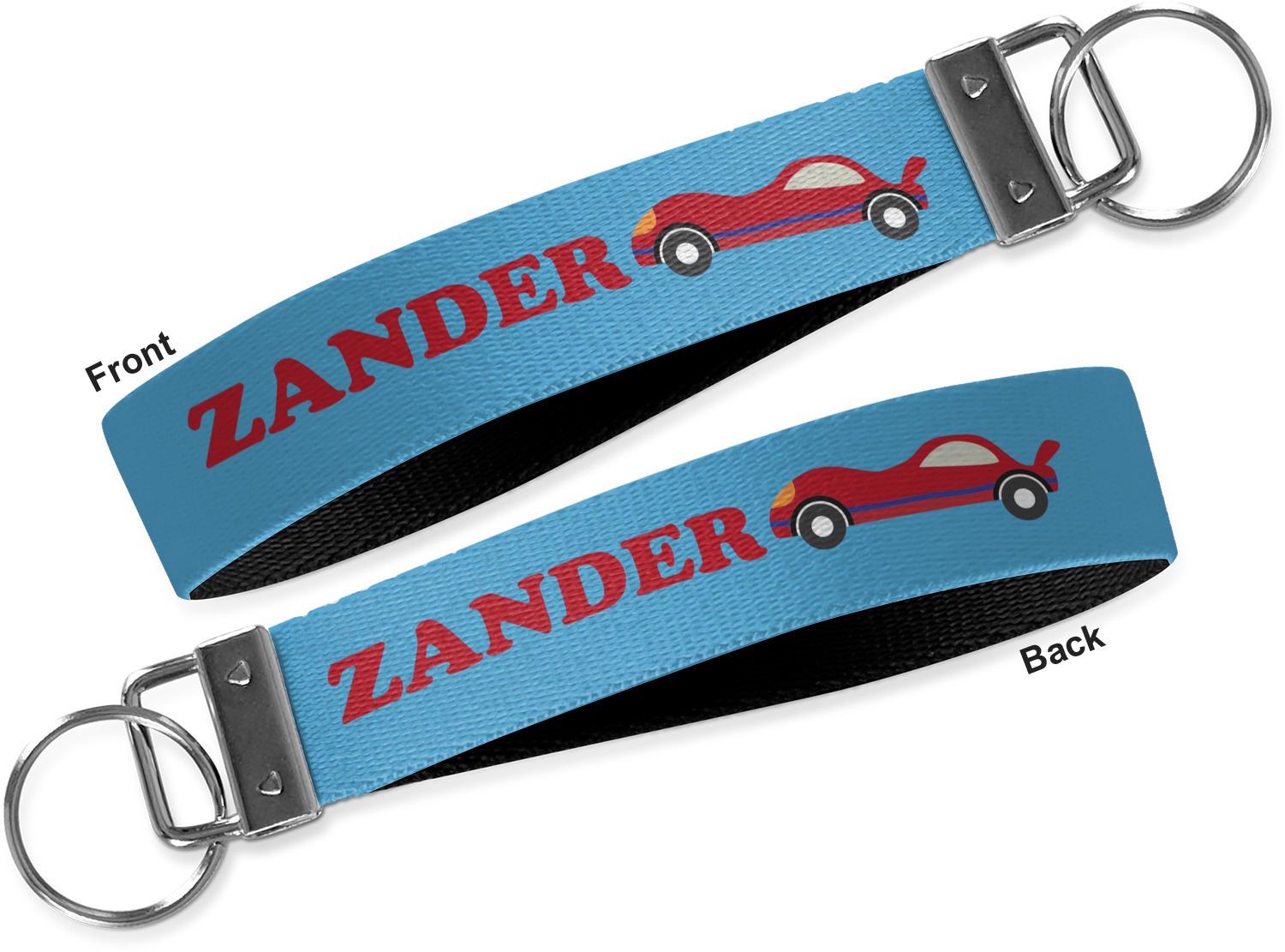 These key fob keychains are made from a polyester weave, right here in the USA. They feature a silver, metal clasp, attached to a round keyring. The piece gives the personalized wristlet a beautiful, finished look. Your customized design is printed on the outside of the keychain strap. We carry these wristlets in two sizes: small, which is 5 inches in width, and large, which is 5.5 inches in width.