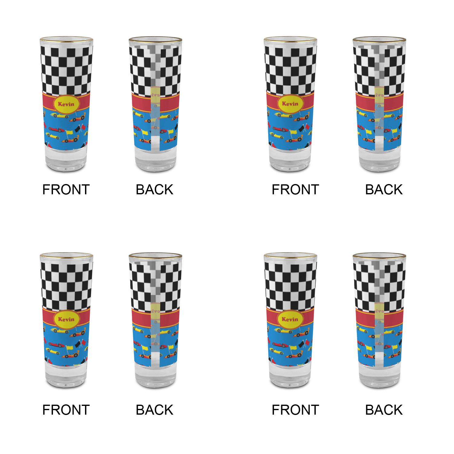 Race Car Designs for 2 oz Shot Glasses - Glass with Gold Rim - Set of 4