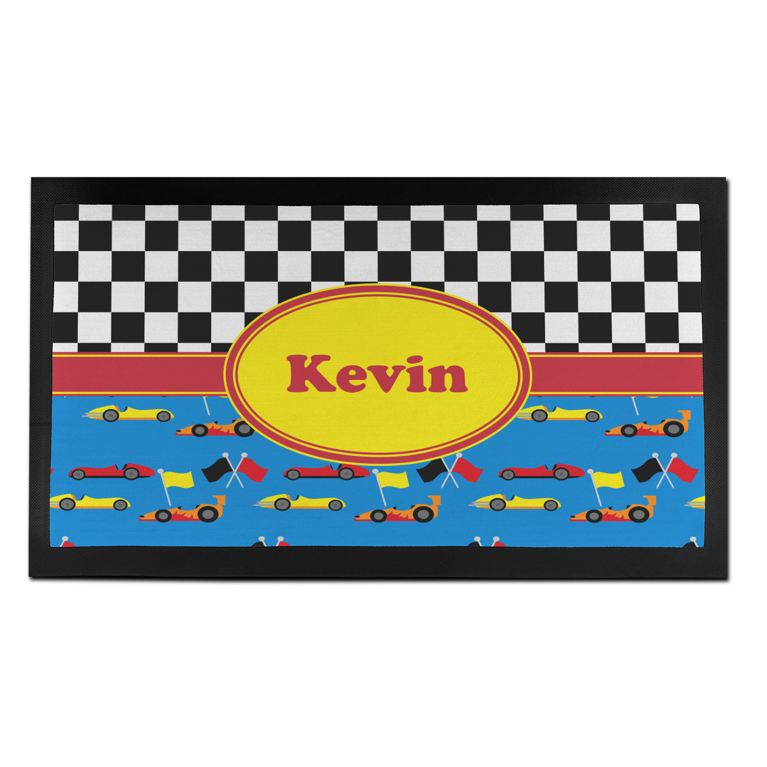 The top of this design is the classic black and white checks. The bottom half of this pattern screams drag racing with cars in red, yellow and orange interspersed with racing flags on a blue background. A yellow trimmed red ribbon and a yellow oval label tie the design together. Personalized with the name of your choice will bring a smile to your racer.
