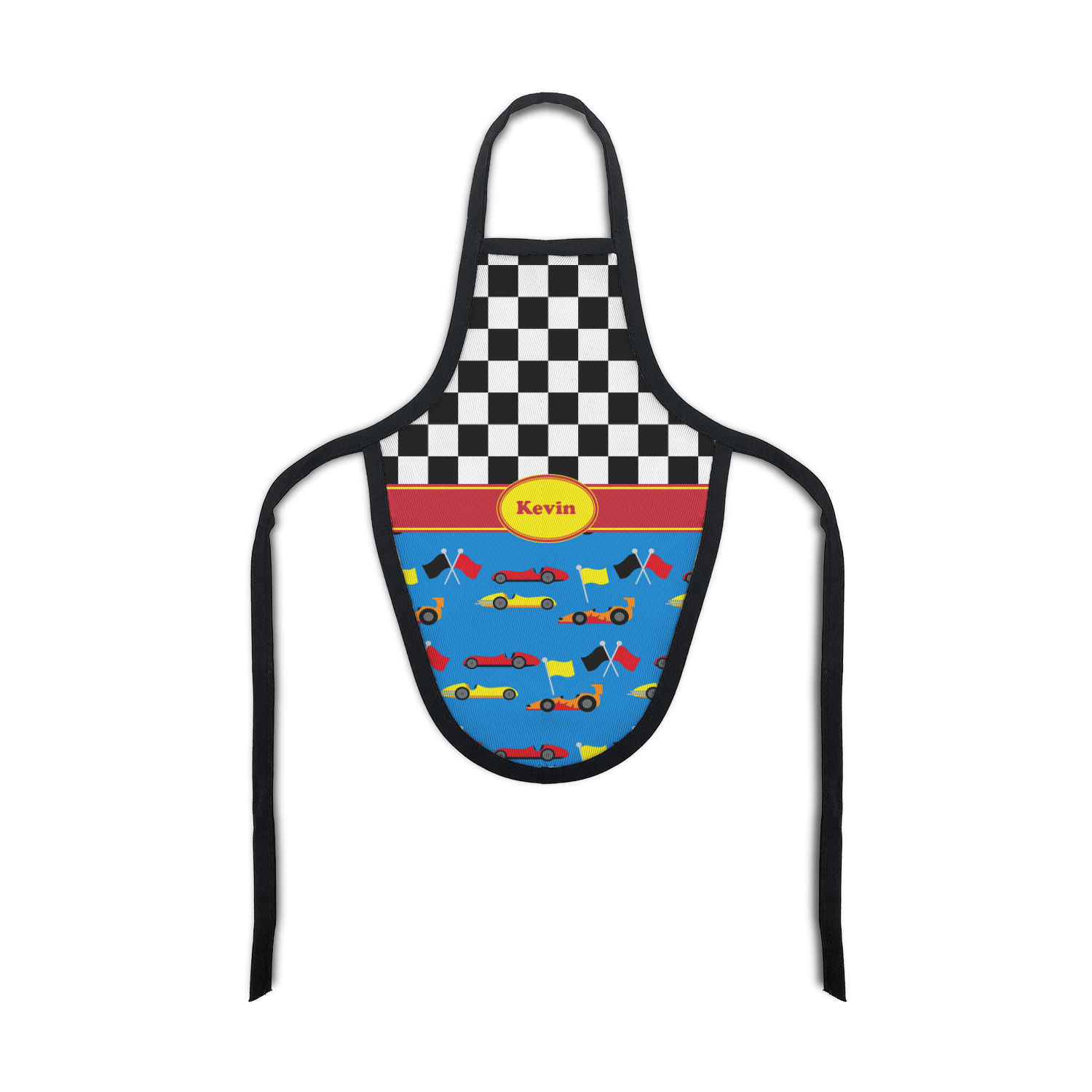 The top of this design is the classic black and white checks. The bottom half of this pattern screams drag racing with cars in red, yellow and orange interspersed with racing flags on a blue background. A yellow trimmed red ribbon and a yellow oval label tie the design together. Personalized with the name of your choice will bring a smile to your racer.