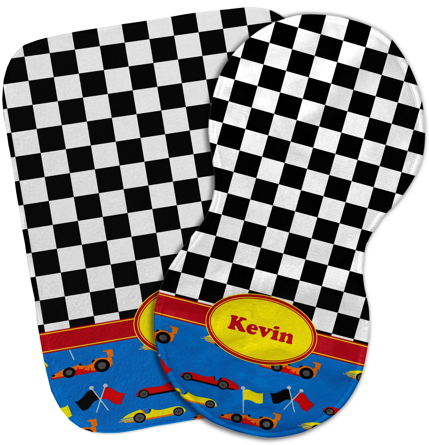 The top of this design is the classic black and white checks. The bottom half of this pattern screams drag racing with cars in red, yellow and orange interspersed with racing flags on a blue background. A yellow trimmed red ribbon and a yellow oval label tie the design together. Personalized with the name of your choice will bring a smile to your racer.