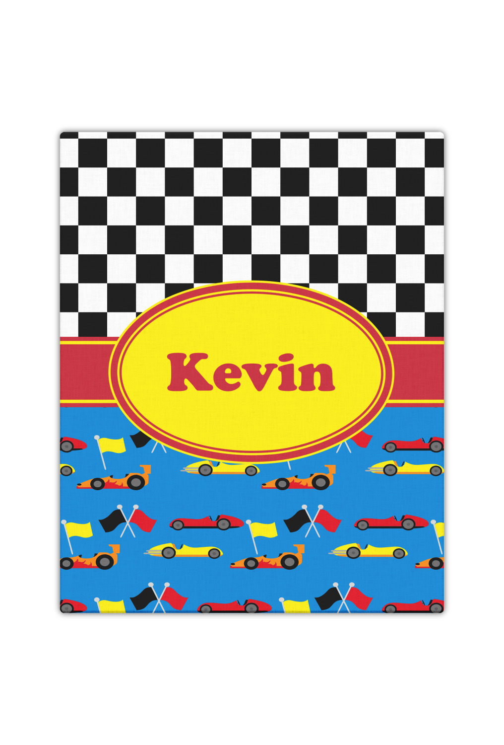 The top of this design is the classic black and white checks. The bottom half of this pattern screams drag racing with cars in red, yellow and orange interspersed with racing flags on a blue background. A yellow trimmed red ribbon and a yellow oval label tie the design together. Personalized with the name of your choice will bring a smile to your racer.