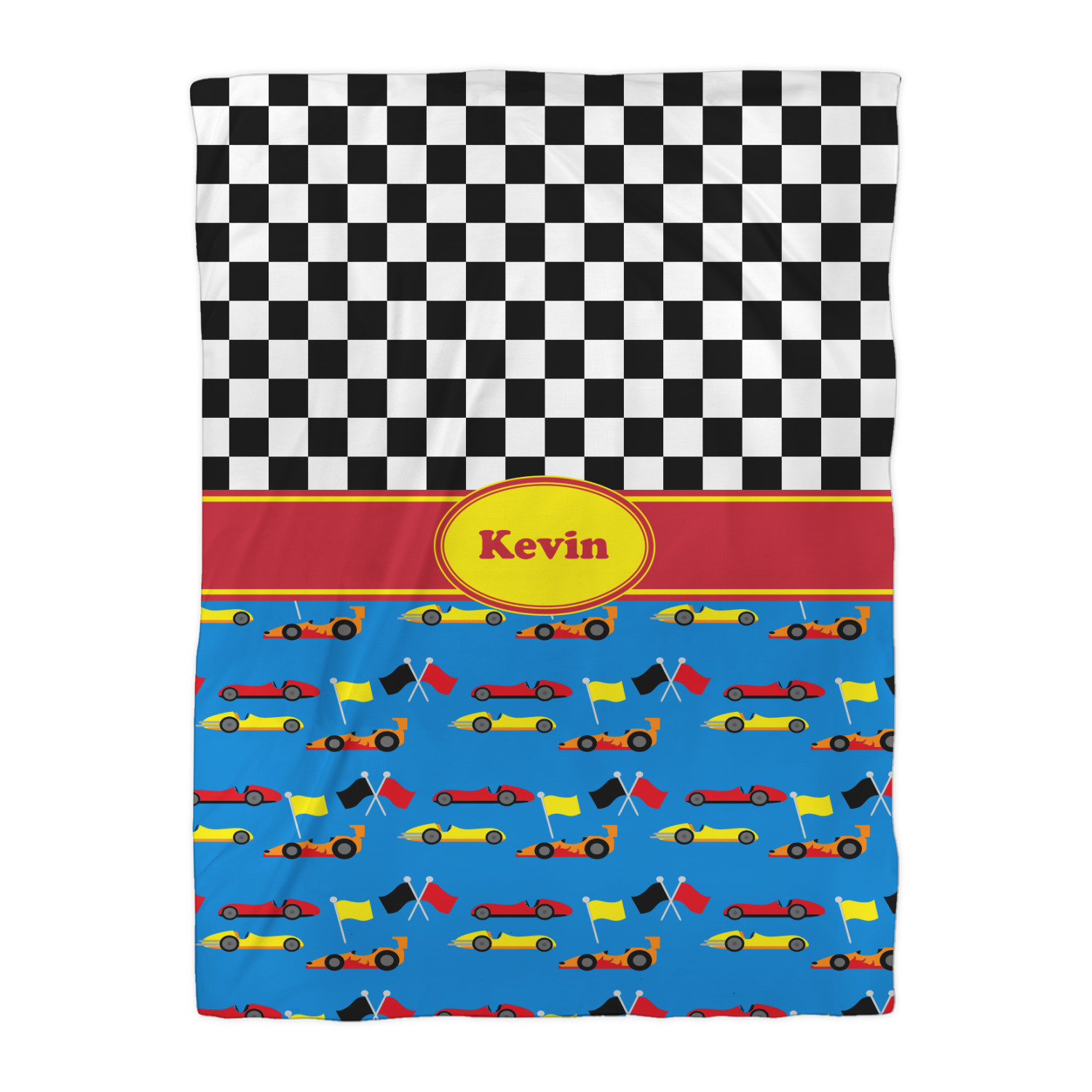 The top of this design is the classic black and white checks. The bottom half of this pattern screams drag racing with cars in red, yellow and orange interspersed with racing flags on a blue background. A yellow trimmed red ribbon and a yellow oval label tie the design together. Personalized with the name of your choice will bring a smile to your racer.