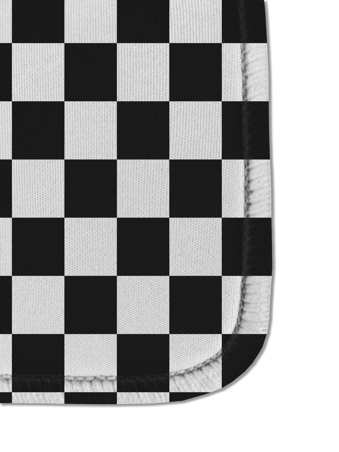 The top of this design is the classic black and white checks. The bottom half of this pattern screams drag racing with cars in red, yellow and orange interspersed with racing flags on a blue background. A yellow trimmed red ribbon and a yellow oval label tie the design together. Personalized with the name of your choice will bring a smile to your racer.