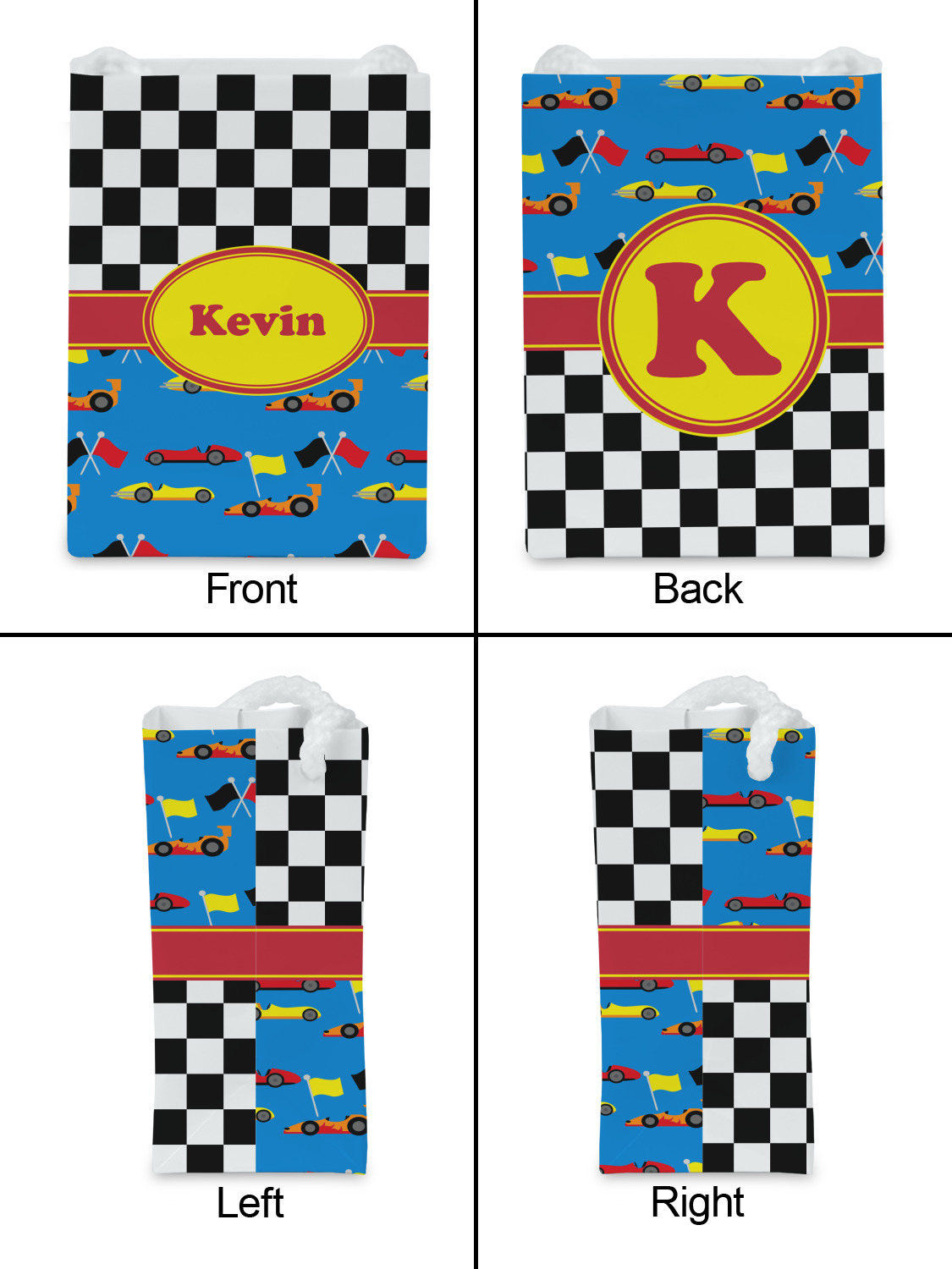 The top of this design is the classic black and white checks. The bottom half of this pattern screams drag racing with cars in red, yellow and orange interspersed with racing flags on a blue background. A yellow trimmed red ribbon and a yellow oval label tie the design together. Personalized with the name of your choice will bring a smile to your racer.