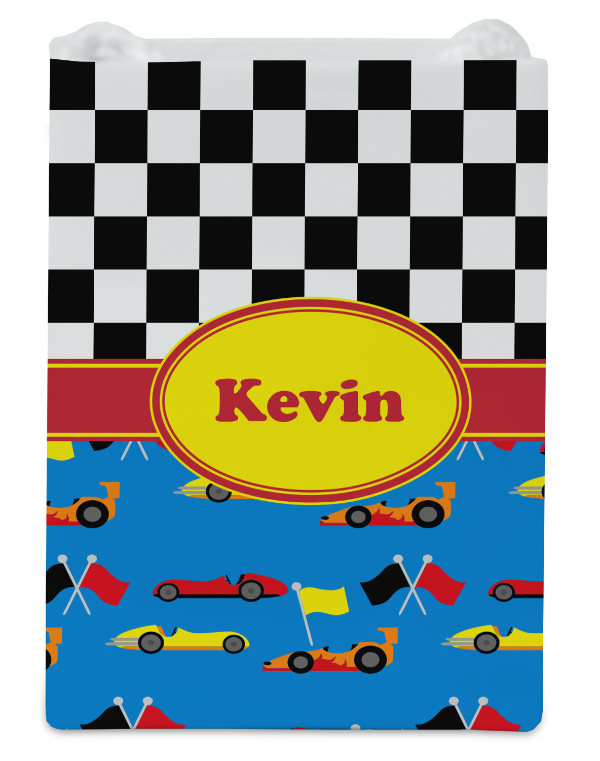 The top of this design is the classic black and white checks. The bottom half of this pattern screams drag racing with cars in red, yellow and orange interspersed with racing flags on a blue background. A yellow trimmed red ribbon and a yellow oval label tie the design together. Personalized with the name of your choice will bring a smile to your racer.
