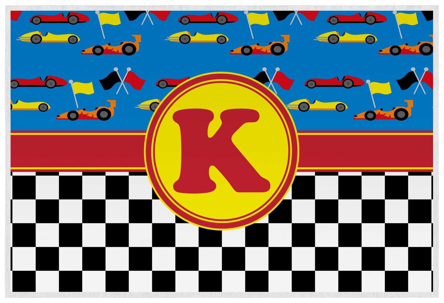 The top of this design is the classic black and white checks. The bottom half of this pattern screams drag racing with cars in red, yellow and orange interspersed with racing flags on a blue background. A yellow trimmed red ribbon and a yellow oval label tie the design together. Personalized with the name of your choice will bring a smile to your racer.