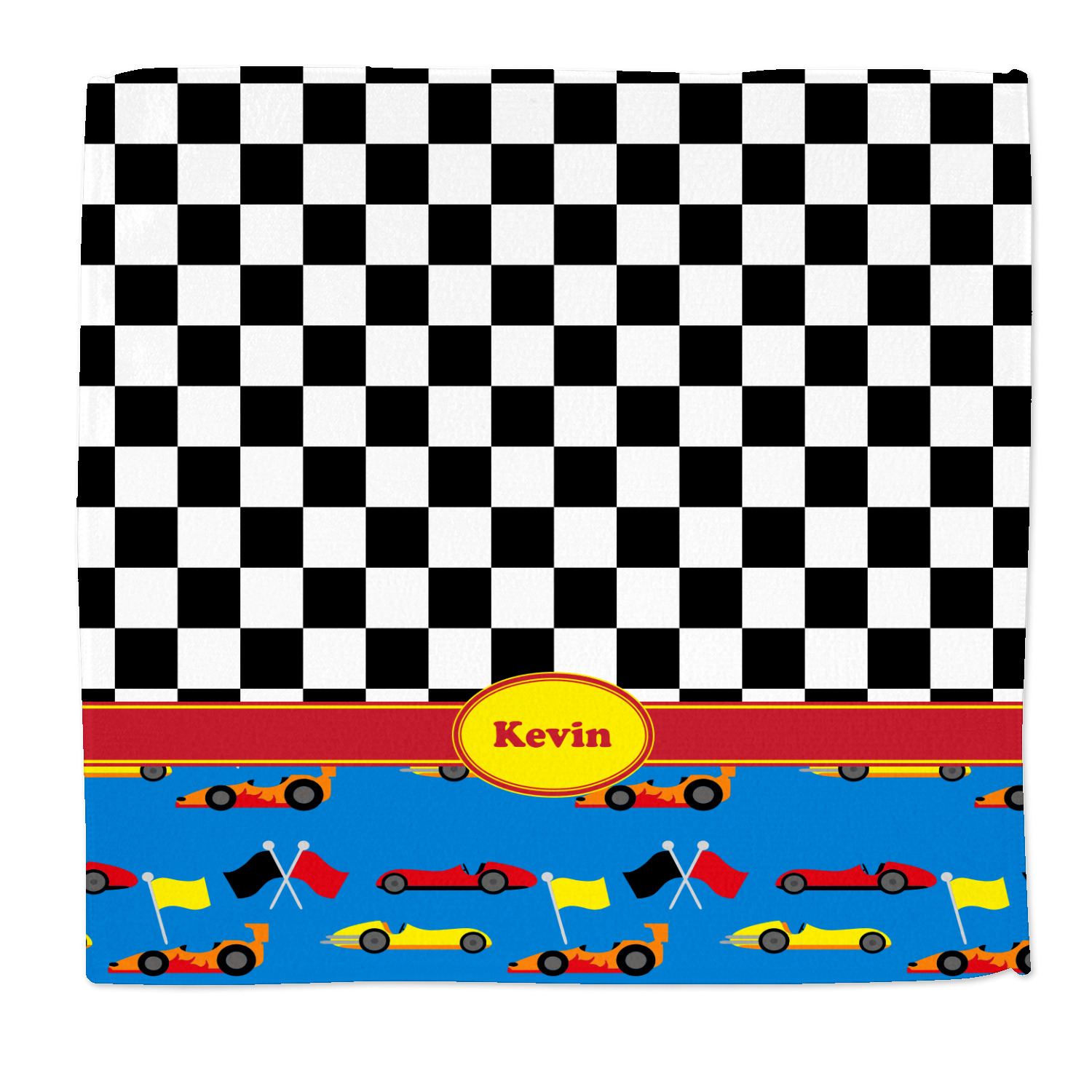 The top of this design is the classic black and white checks. The bottom half of this pattern screams drag racing with cars in red, yellow and orange interspersed with racing flags on a blue background. A yellow trimmed red ribbon and a yellow oval label tie the design together. Personalized with the name of your choice will bring a smile to your racer.