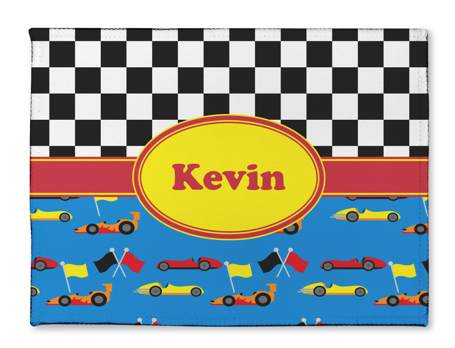 The top of this design is the classic black and white checks. The bottom half of this pattern screams drag racing with cars in red, yellow and orange interspersed with racing flags on a blue background. A yellow trimmed red ribbon and a yellow oval label tie the design together. Personalized with the name of your choice will bring a smile to your racer.