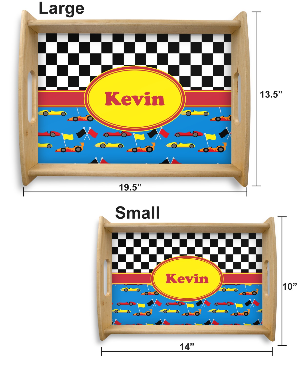 This serving tray with handles features square edges and two rounded sides, creating a very modern look. Each side is fabricated from a beautifully cut, natural wood. The bottom of the interior of the tray displays your customized design in bright, vibrant color. The tray is sold in both a black color and a natural wood look. Each variation of the wood serving tray has two sizes: Small, which is 14" x 10" x 2.25", and Large, which is 19.5" x 13.5" x 2.75".
