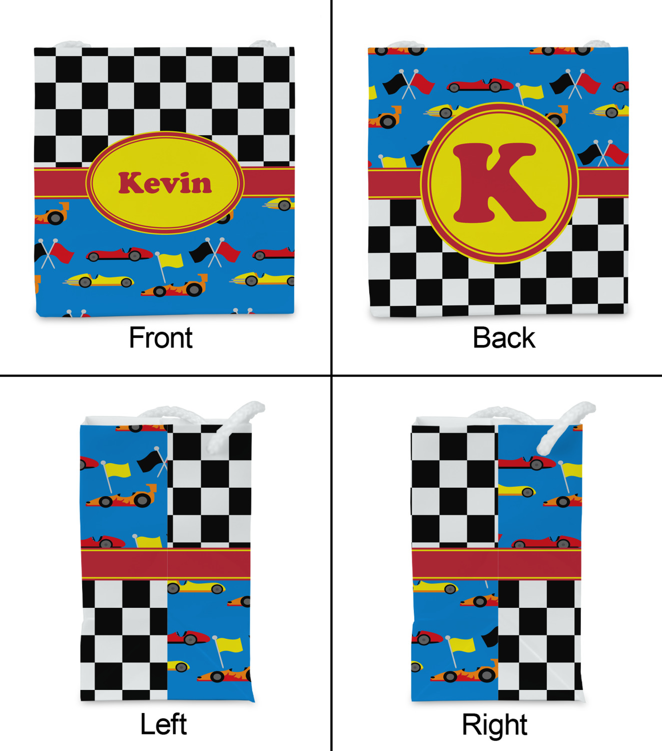 The top of this design is the classic black and white checks. The bottom half of this pattern screams drag racing with cars in red, yellow and orange interspersed with racing flags on a blue background. A yellow trimmed red ribbon and a yellow oval label tie the design together. Personalized with the name of your choice will bring a smile to your racer.