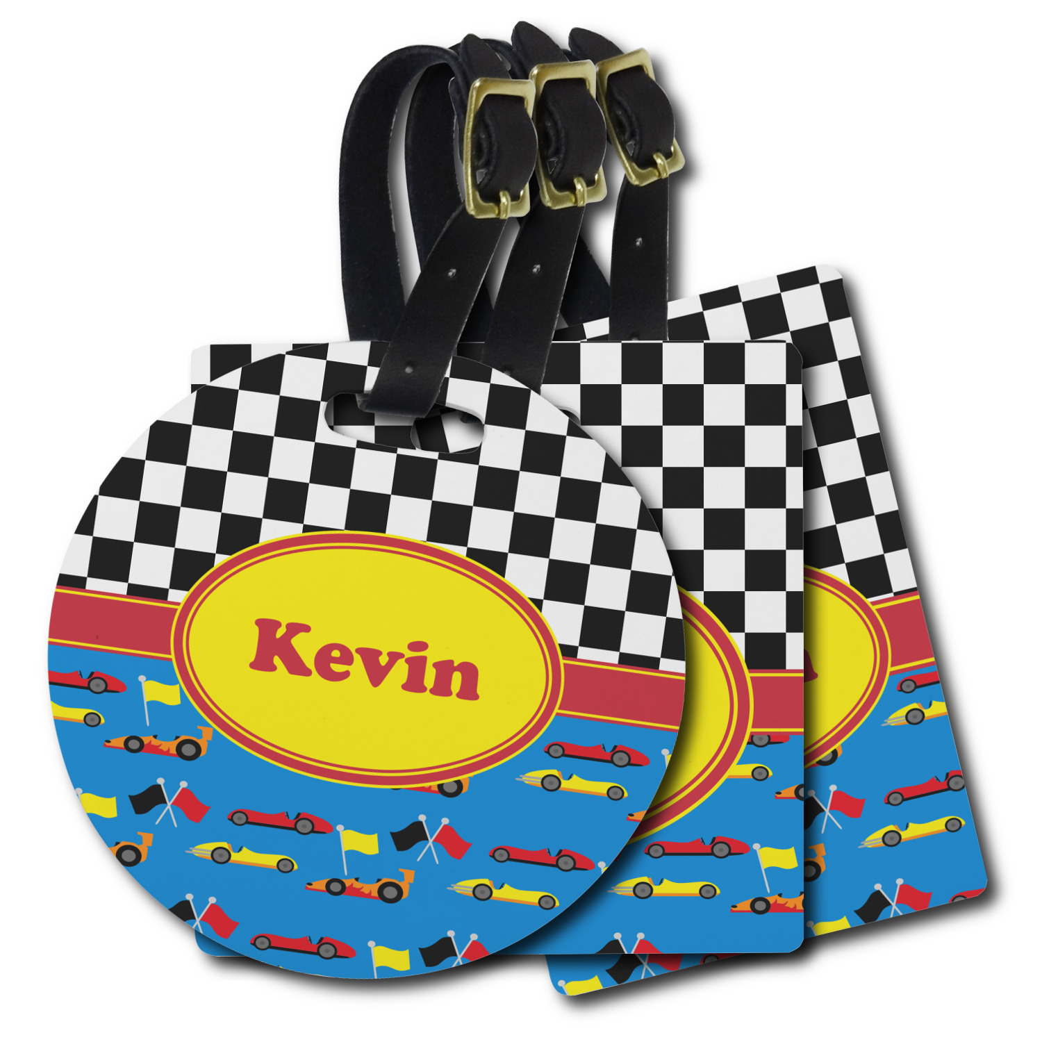 These personalized bag tags are sold in a variety of shapes, so that you may find the product that meets your vision exactly. We sell a round luggage tag, which measures at approximately 4" x 4". Our square luggage tag is about 3.5" x 3.5", while our rectangular version is 2.75" x 4 ".